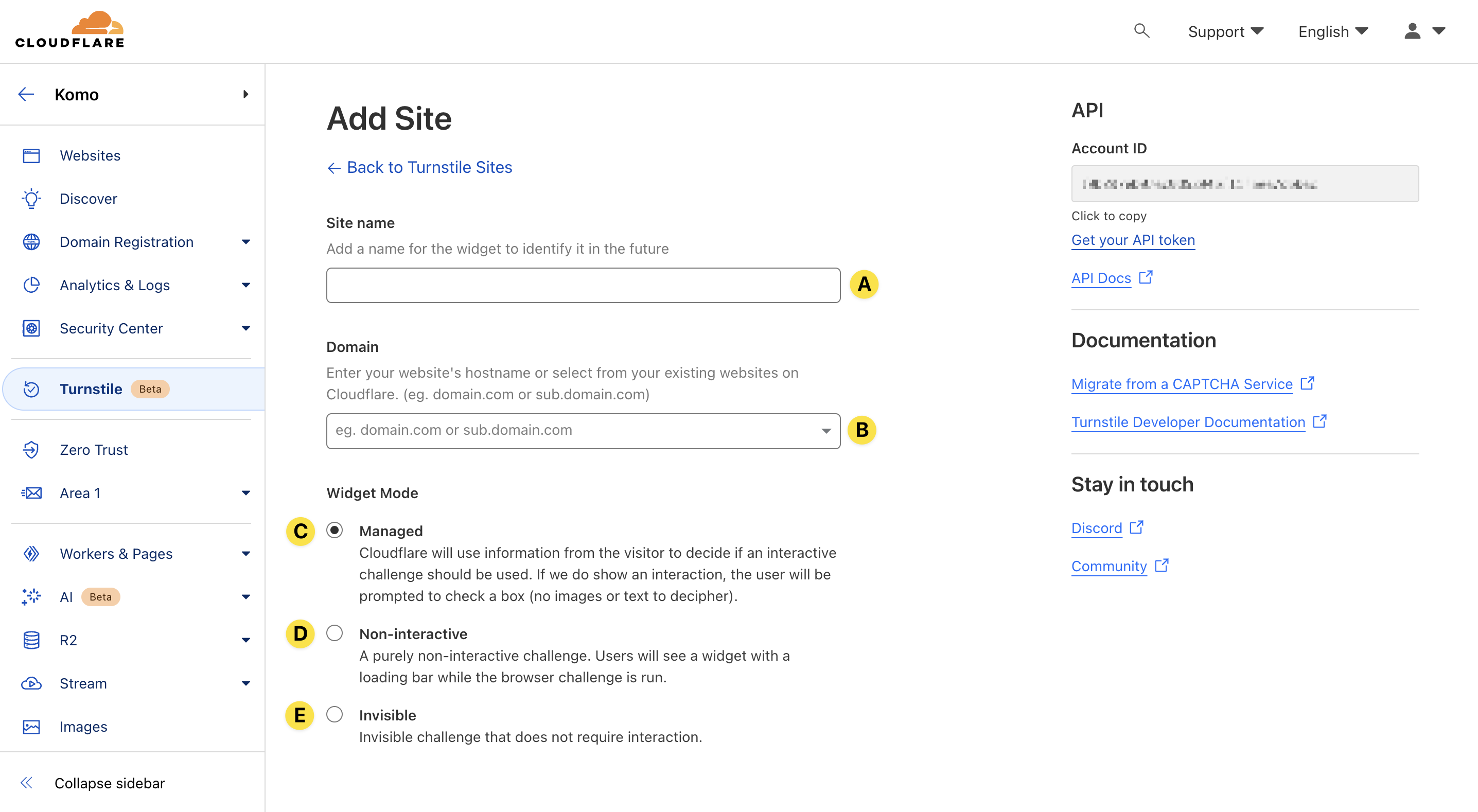 - (C) Here you can select from different modes. Select Managed if you want Cloudflare to decide whether or not the checkbox needs to be manually filled for assumed bot activity.