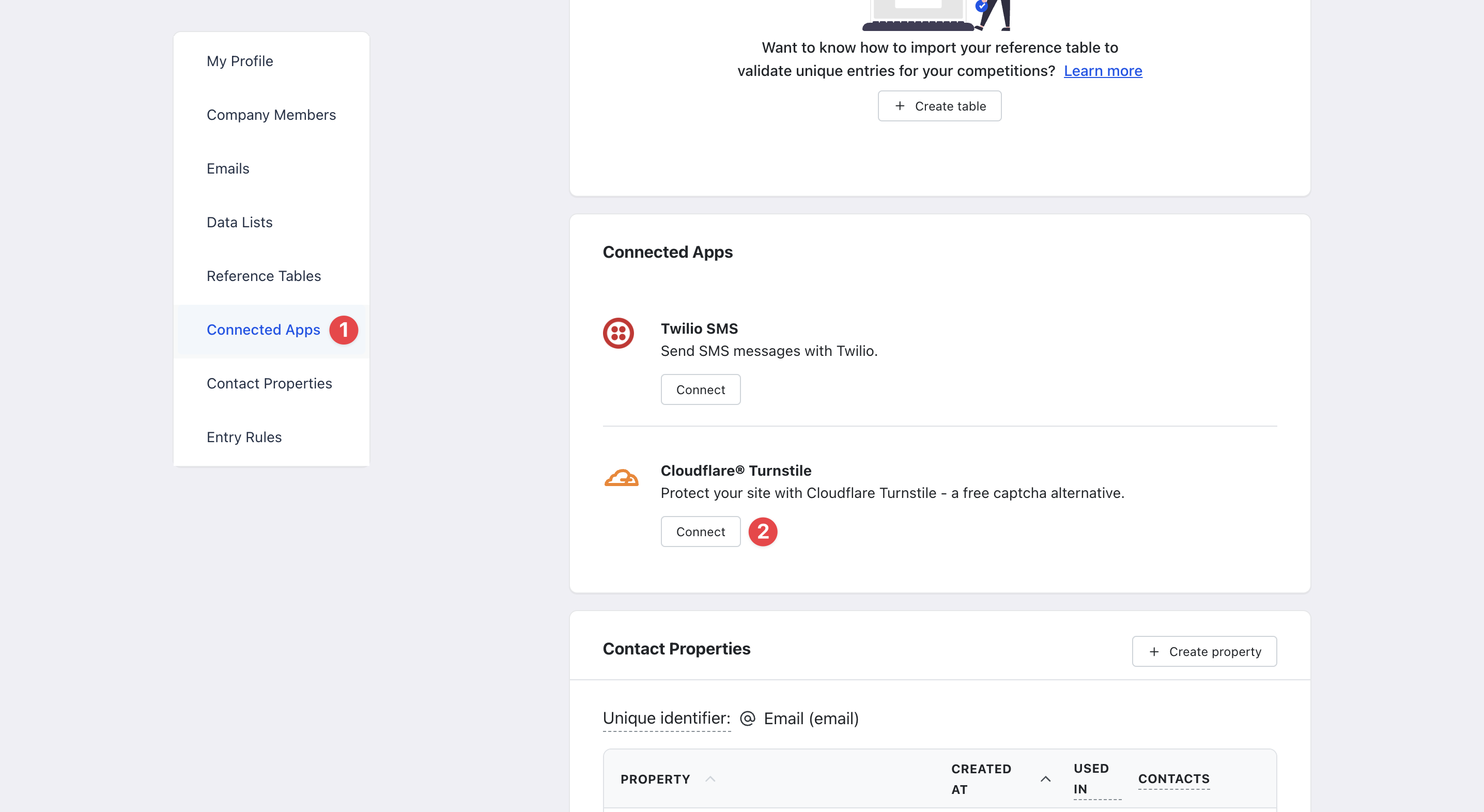 - (1) Click on Create property Connnected Apps on the left sidebar.