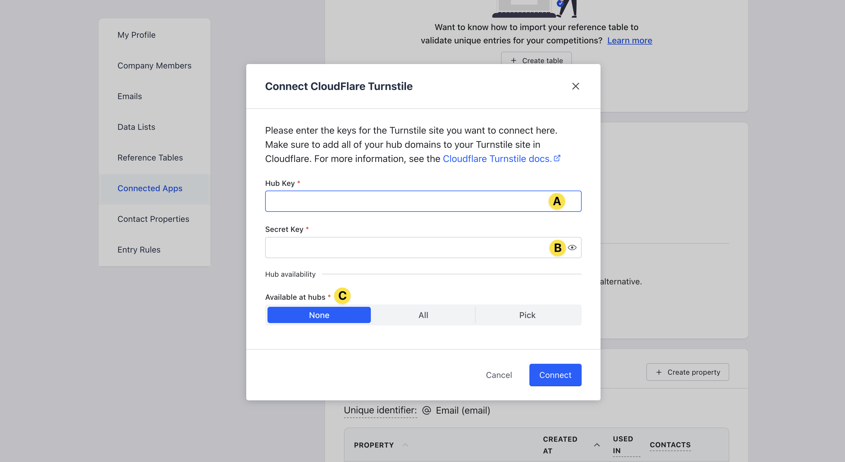 Any Hubs selected here must be on the Cloudflare Turnstile list in Step 1 (2C).