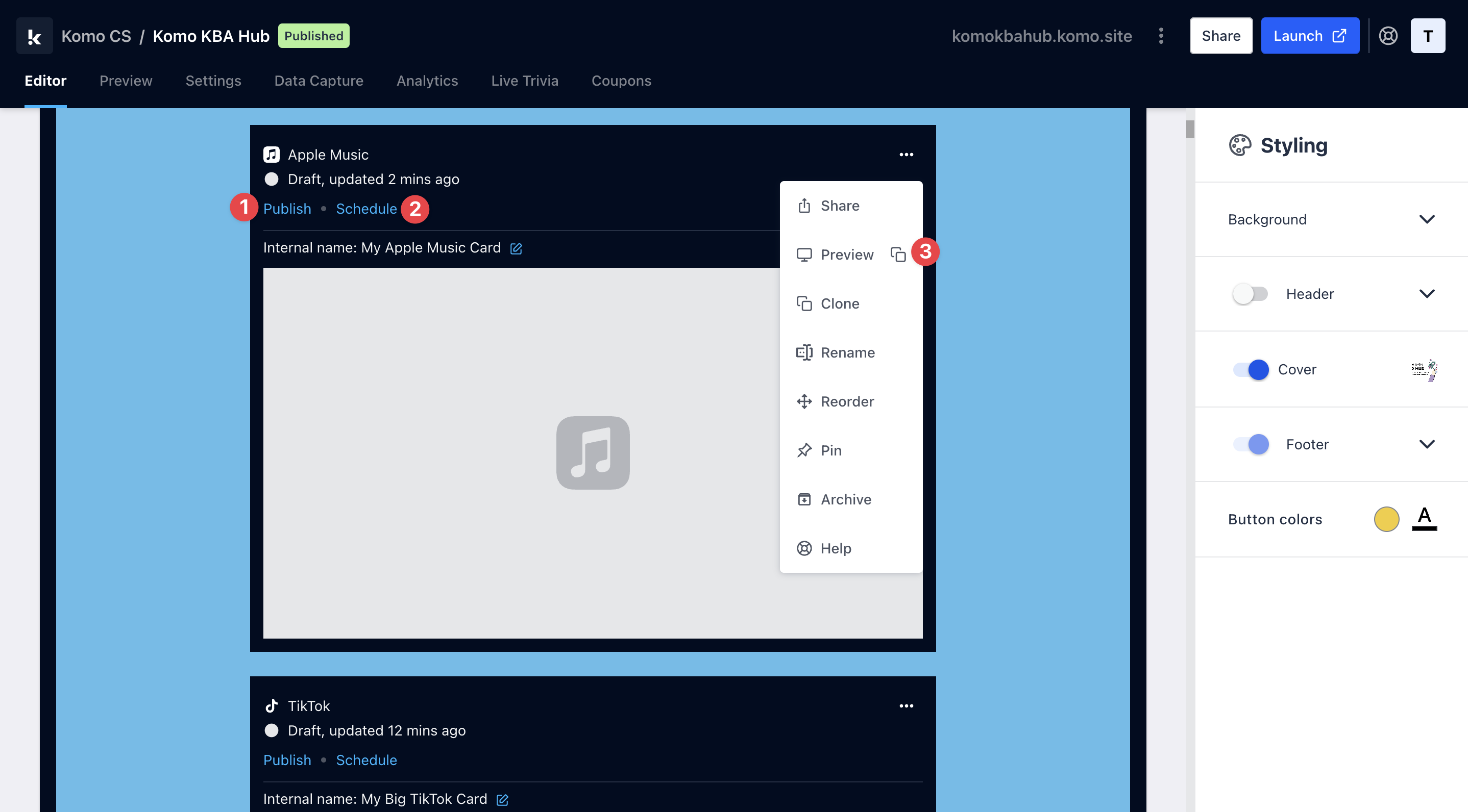- (3) Click on … to Preview and interact with the card on the front end from a user’s perspective before publishing it.