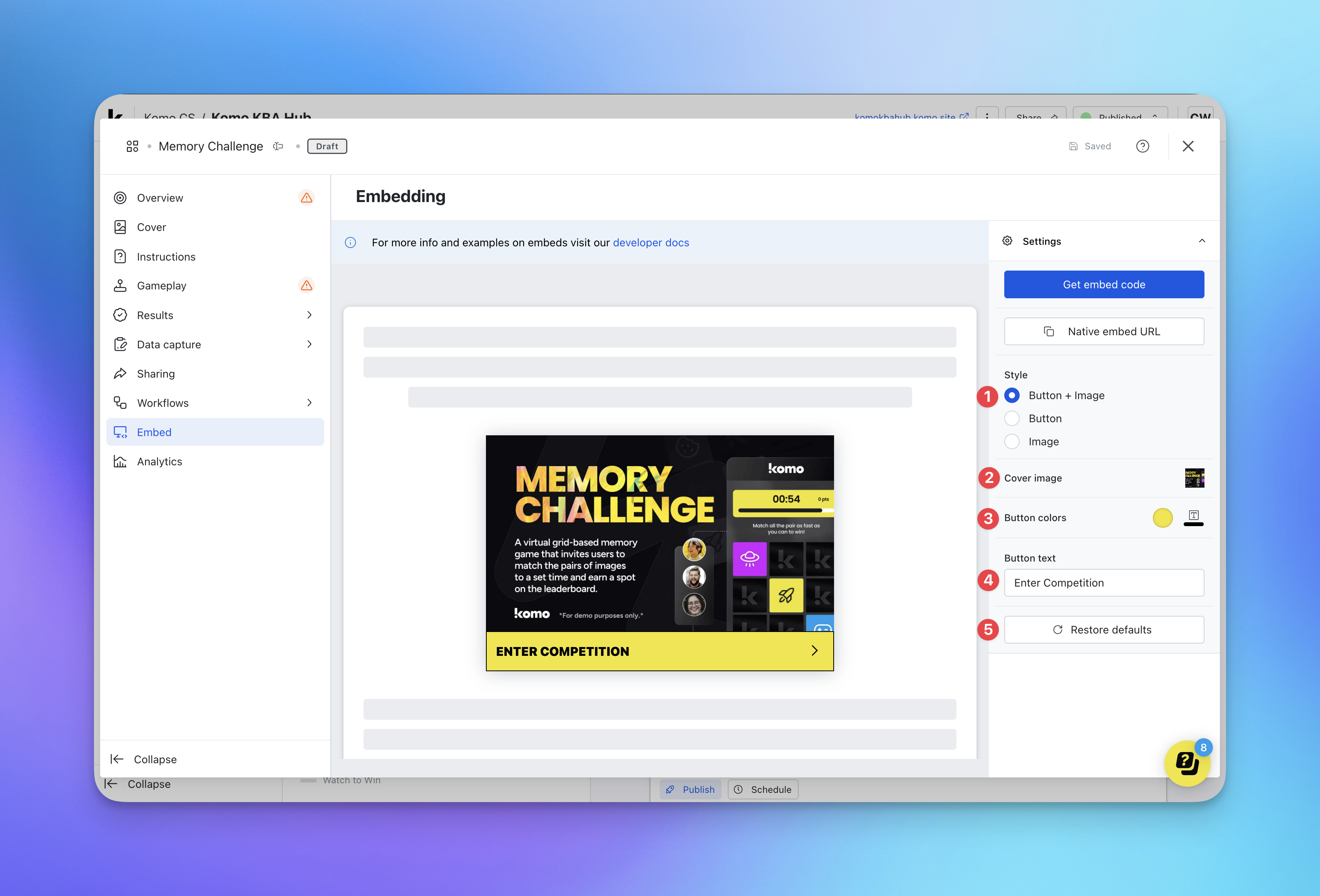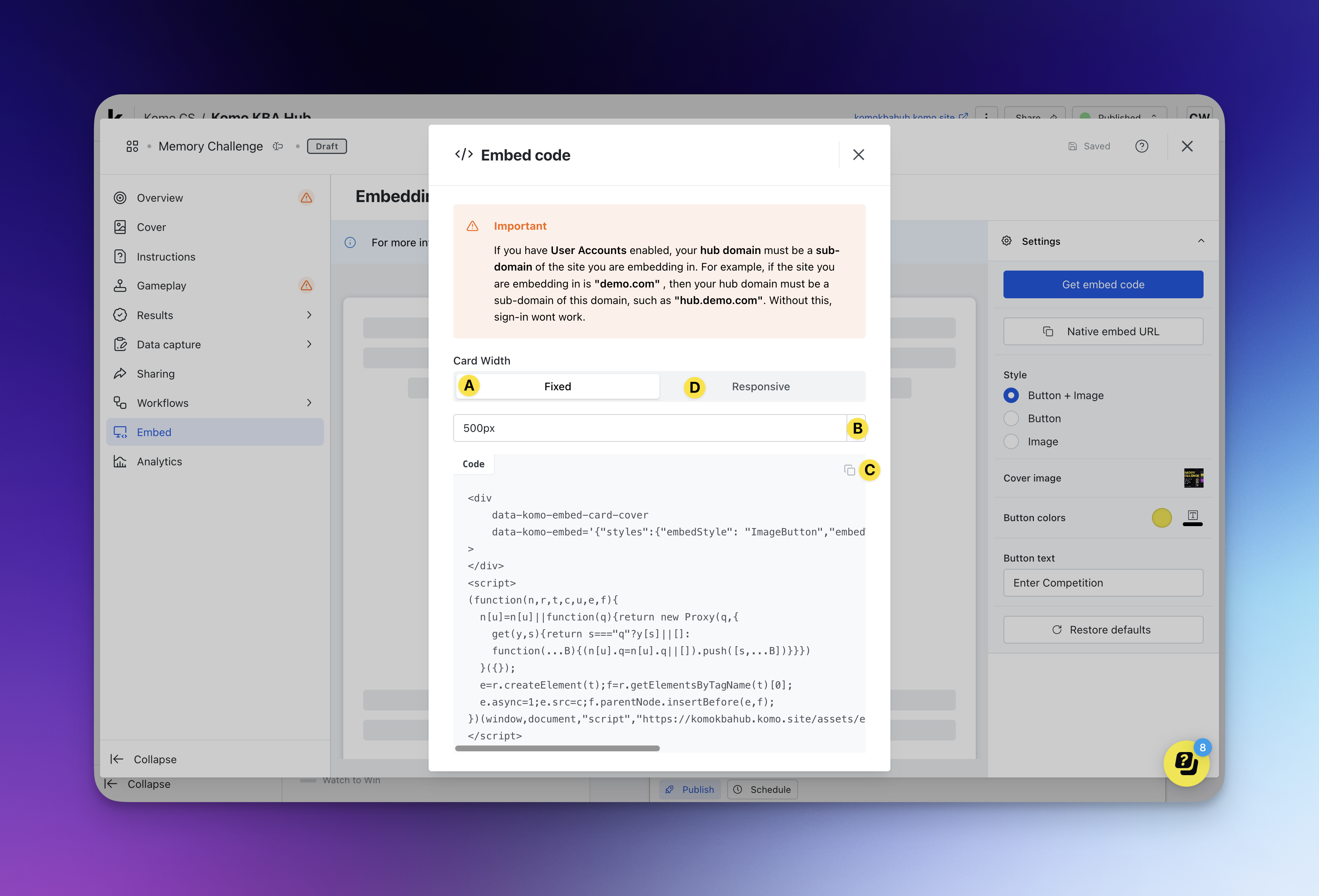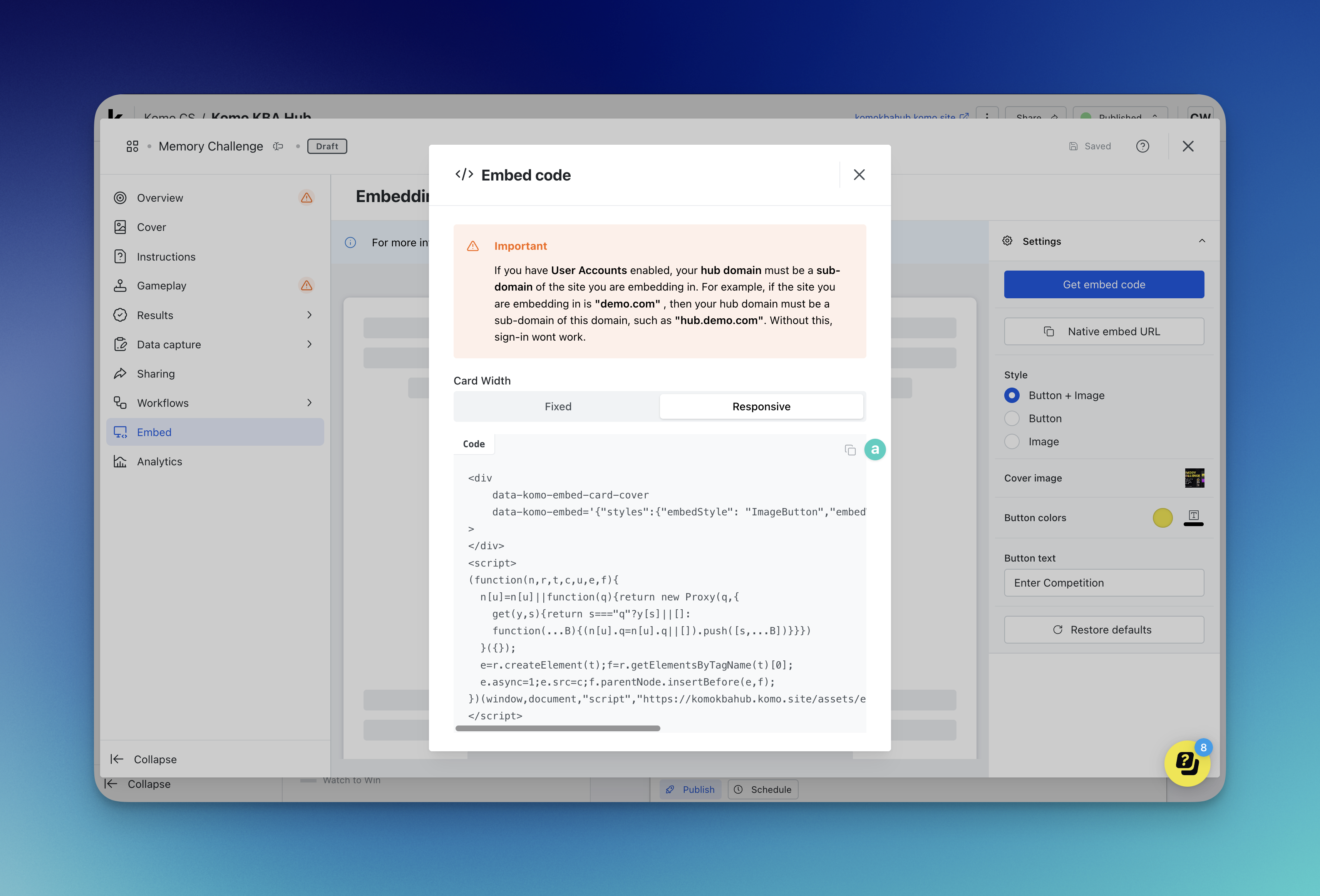 Users will only be able to access your Hub through the embed if you include a link out to the Hub within the competition card.