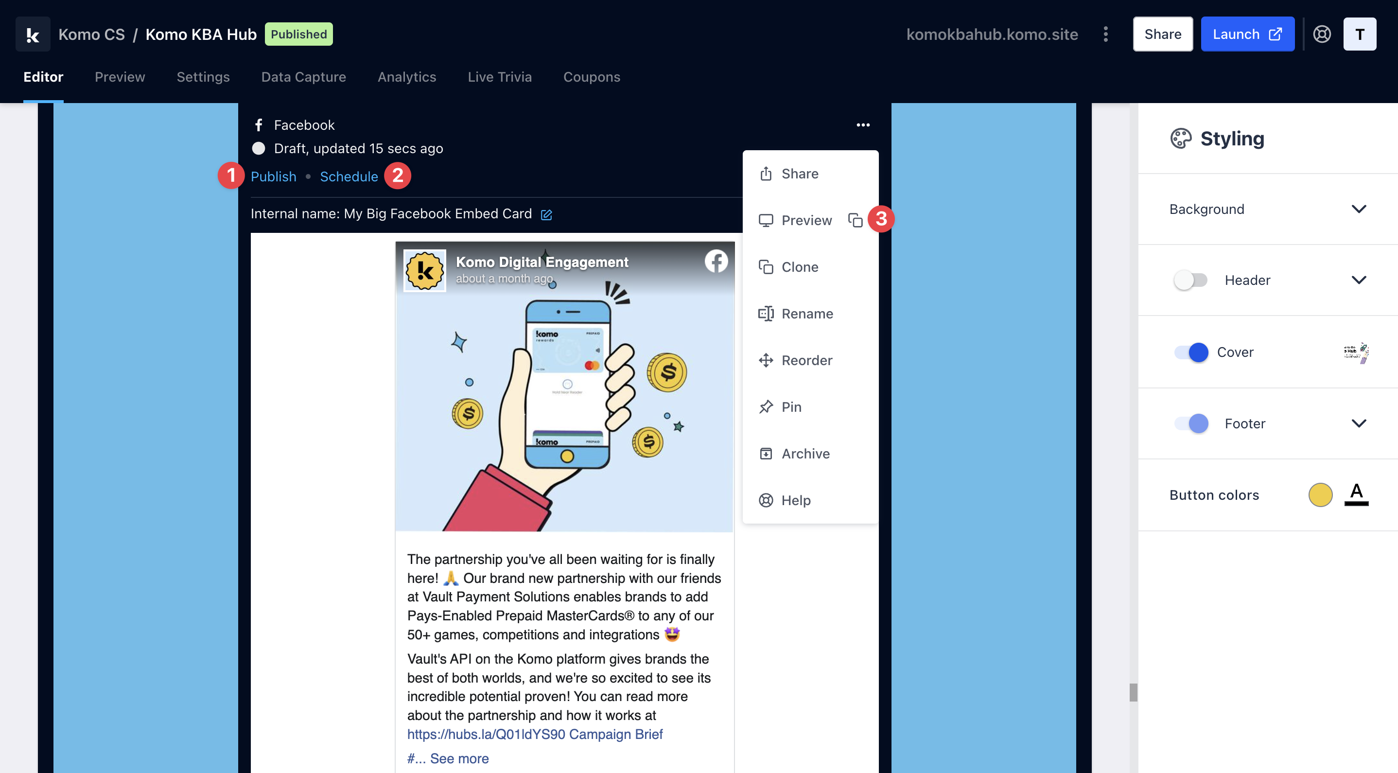 - (3) Click on … to Preview and interact with the card on the front end from a user’s perspective before publishing it.