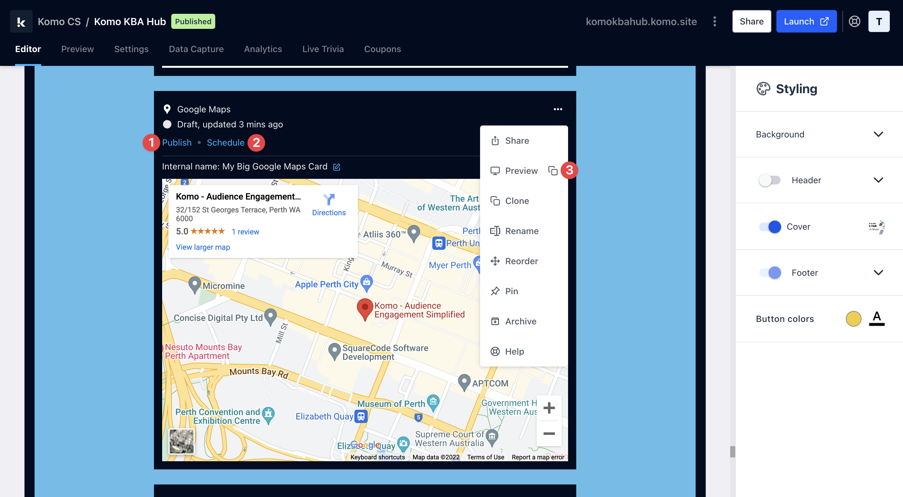 - (3) Click on … to Preview and interact with the card on the front end from a user’s perspective before publishing it.