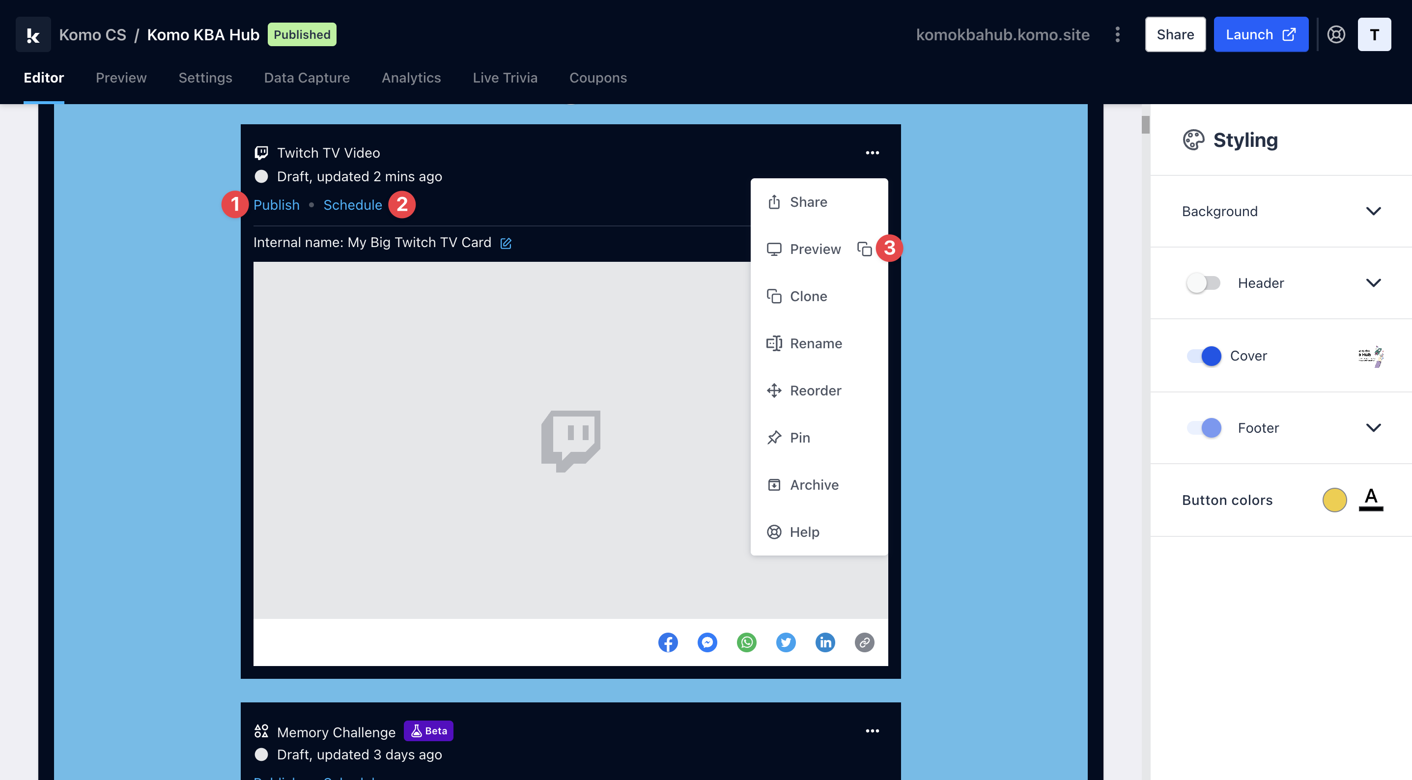 - (3) Click on **… **to Preview and interact with the card on the front end from a user’s perspective before publishing it.