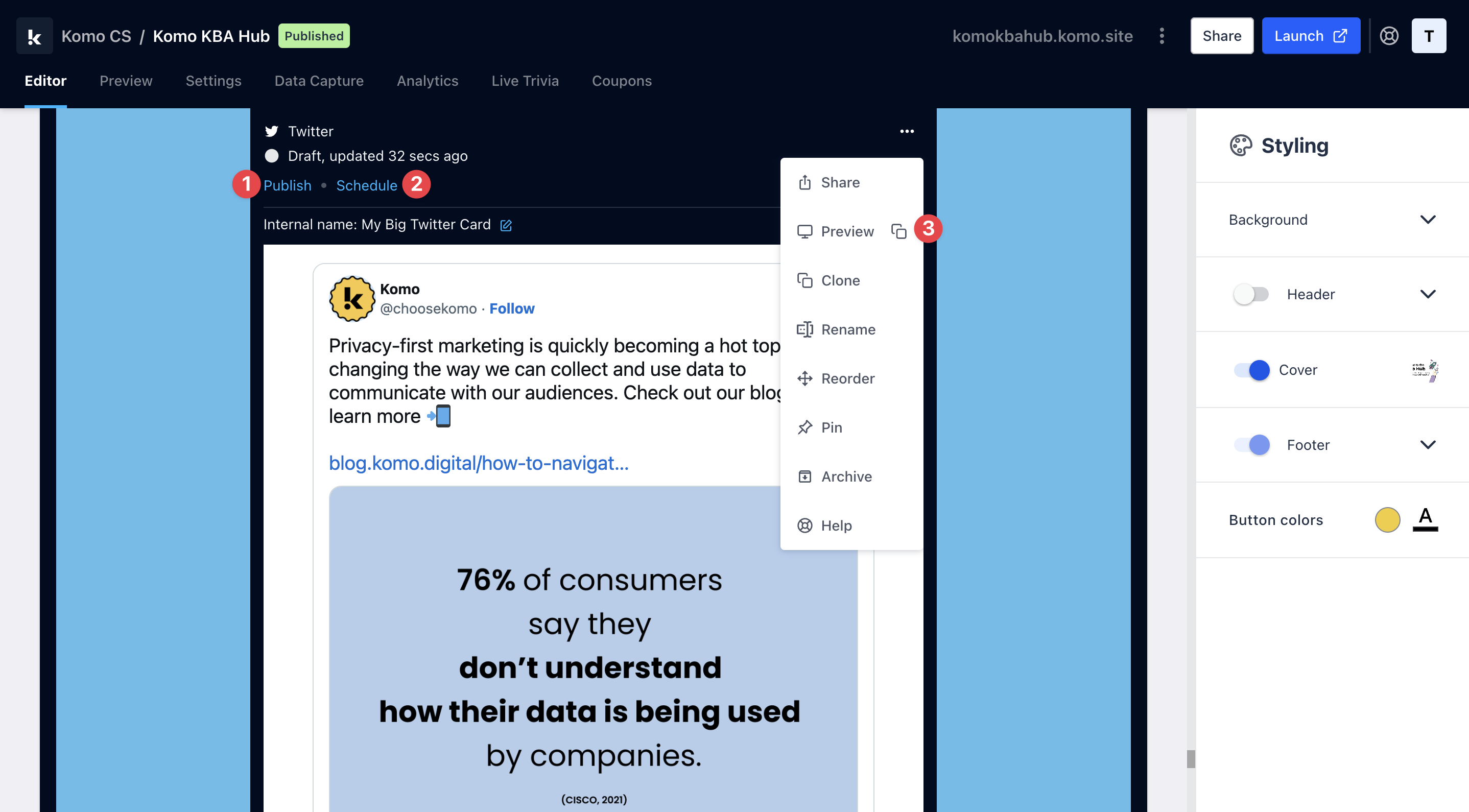- (3) Click on … to Preview and interact with the card on the front end from a user’s perspective before publishing it.