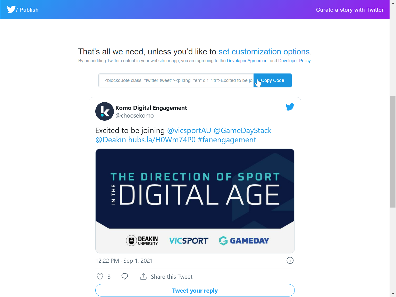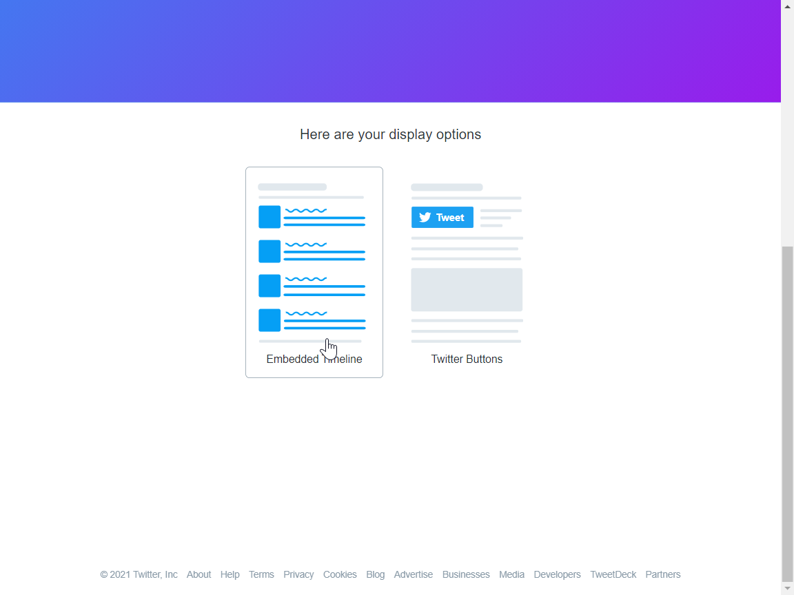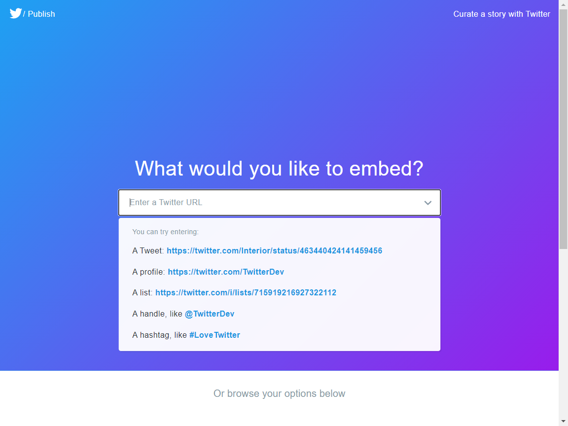 Visit publish.twitter.com to start the guided journey for getting twitter embed code