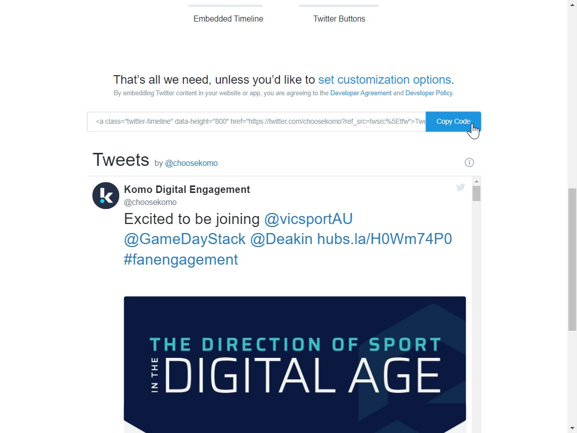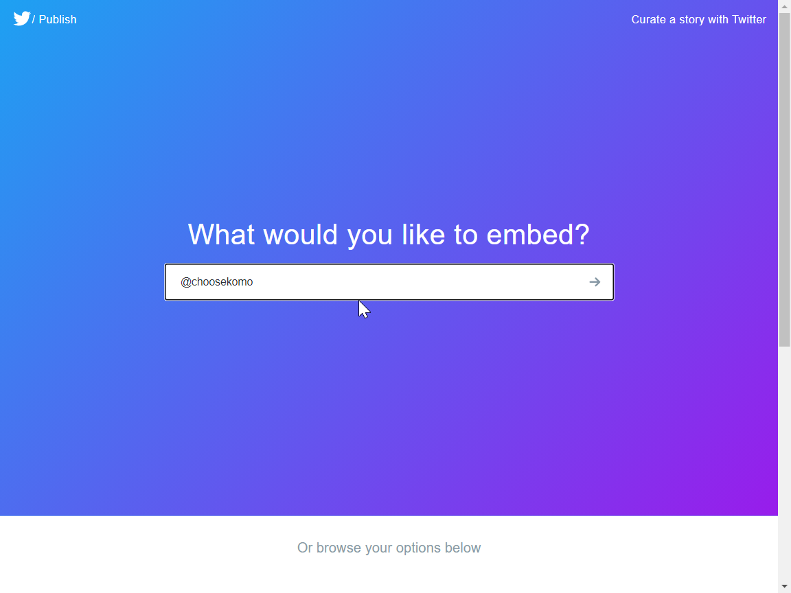 From here you can choose to embed individual tweets, user timelines, and custom lists. In this example, we will be embedding the @choosekomo Twitter timeline. Enter the Twitter handle in the box and hit enter.
