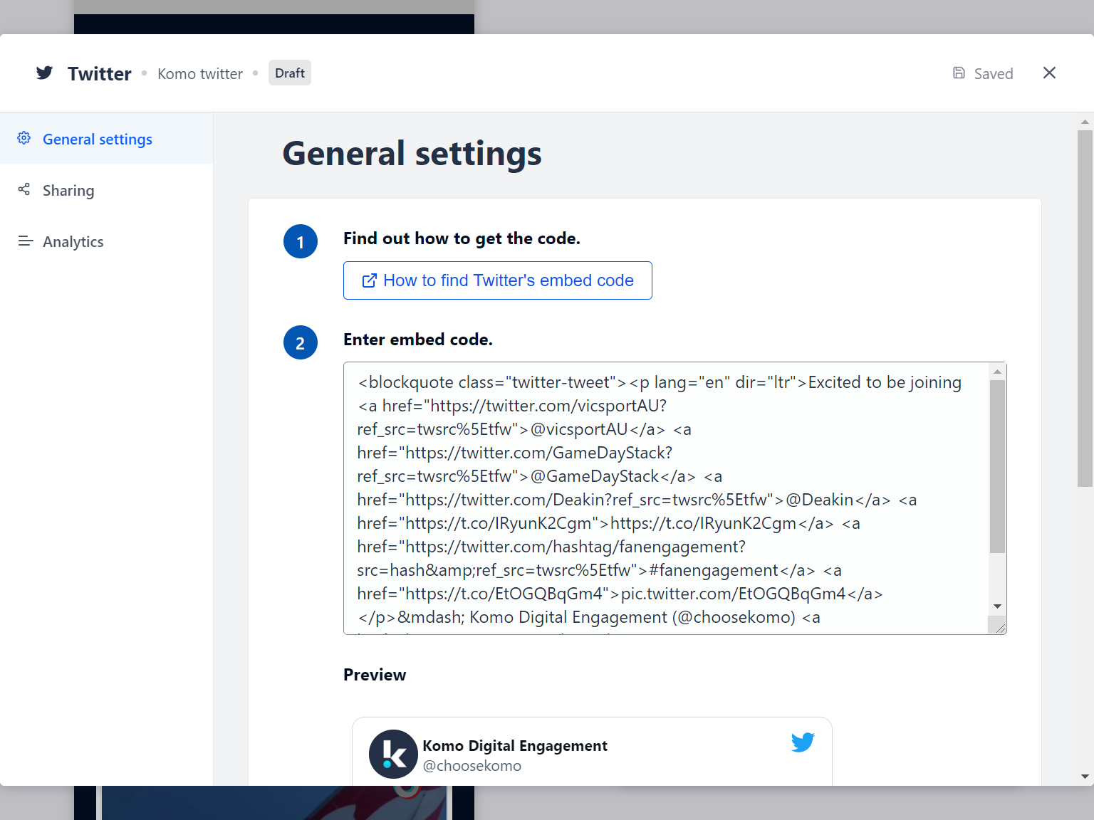 - Embedding timelines and lists will automatically pull through the 20 latest tweets.