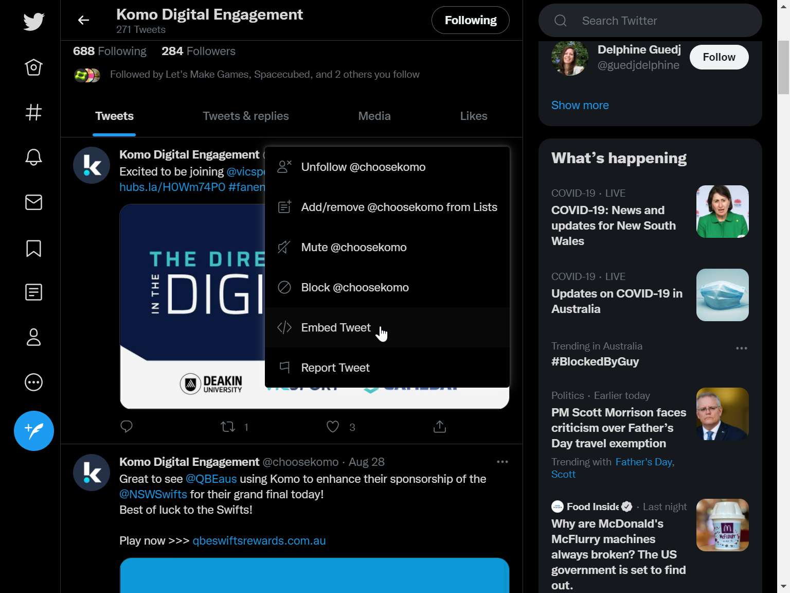 - Once there, click Add content, from here select Embeds and then Twitter.