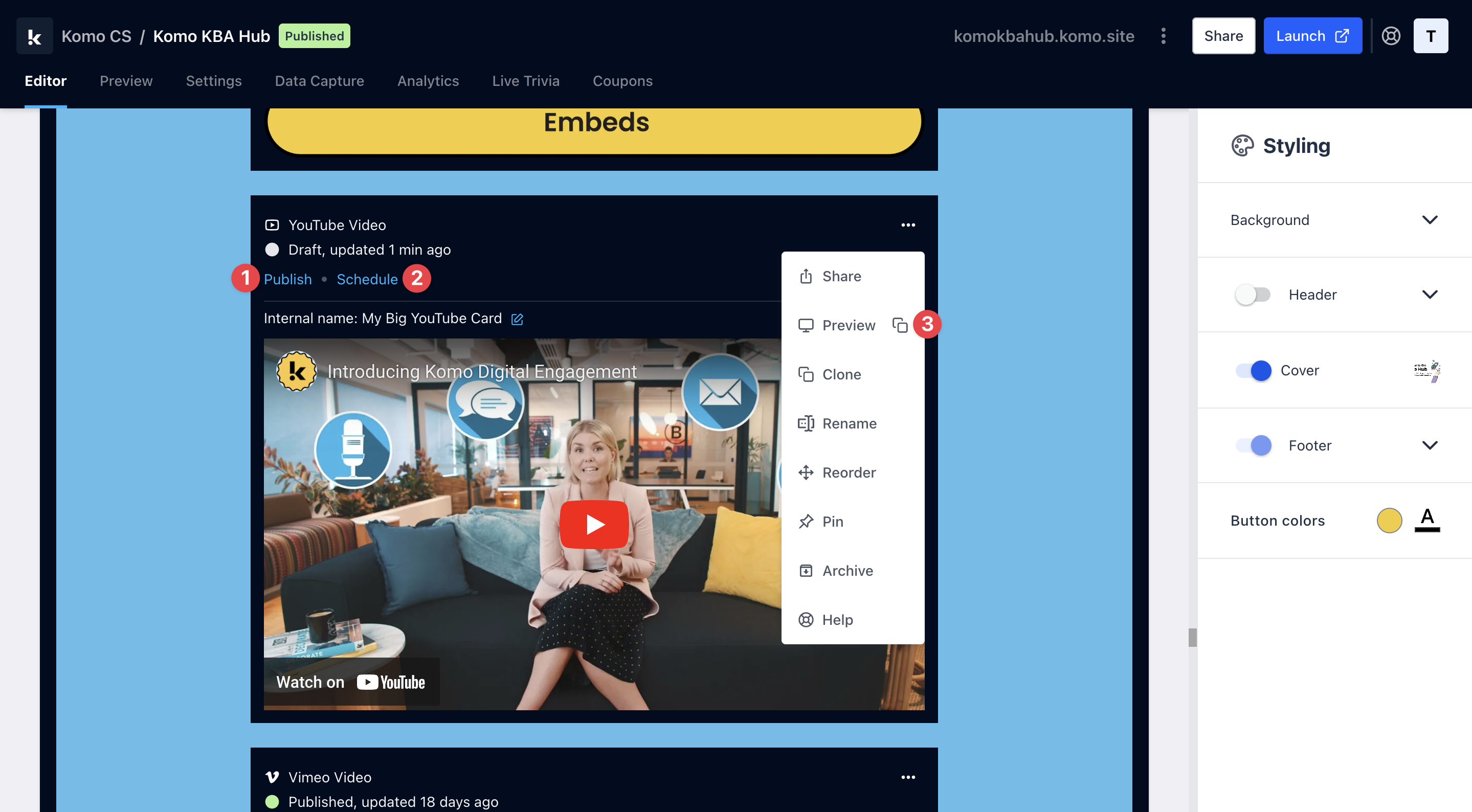 - (3) Click on **… **to Preview and interact with the card on the front end from a user’s perspective before publishing it.