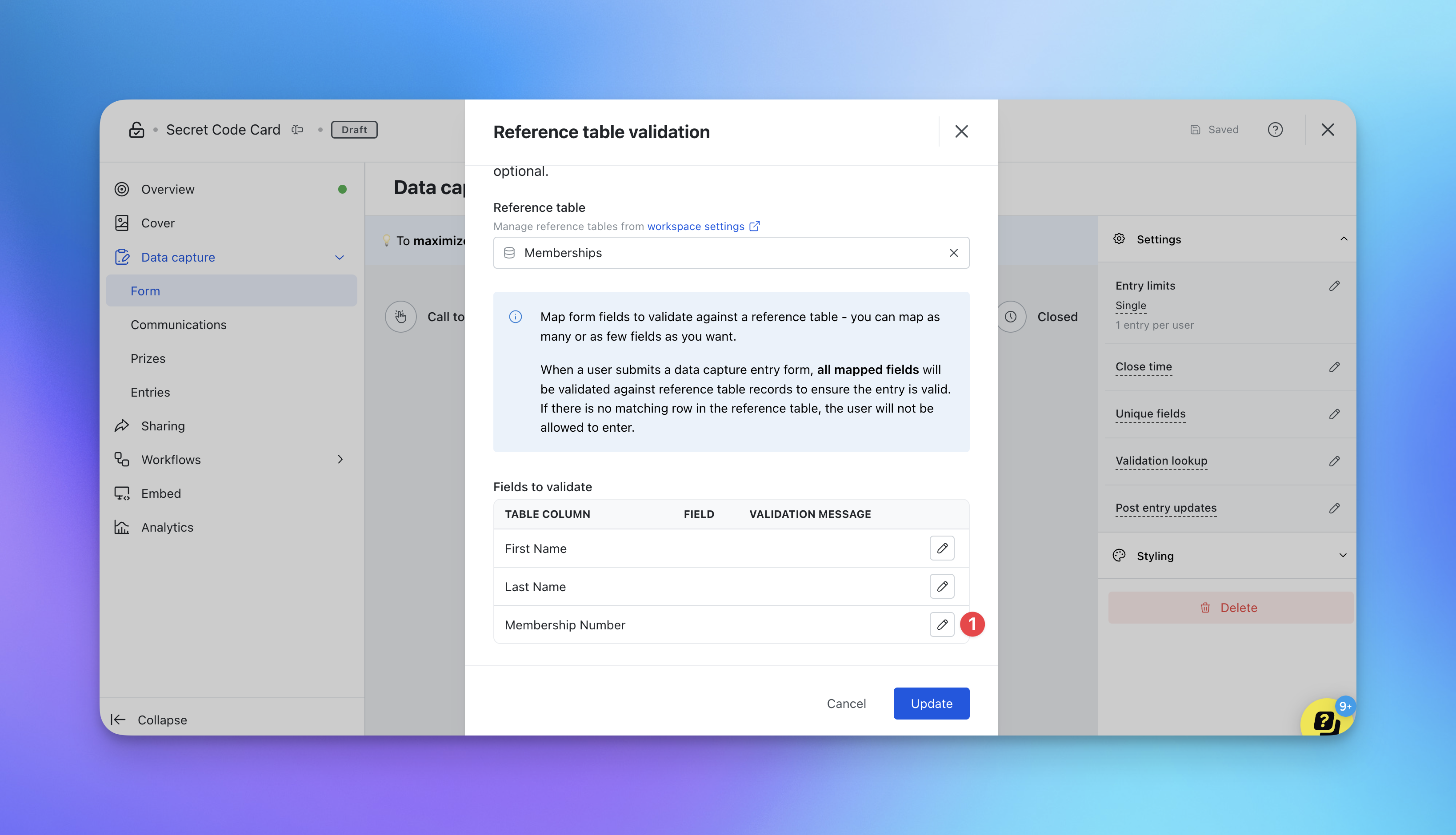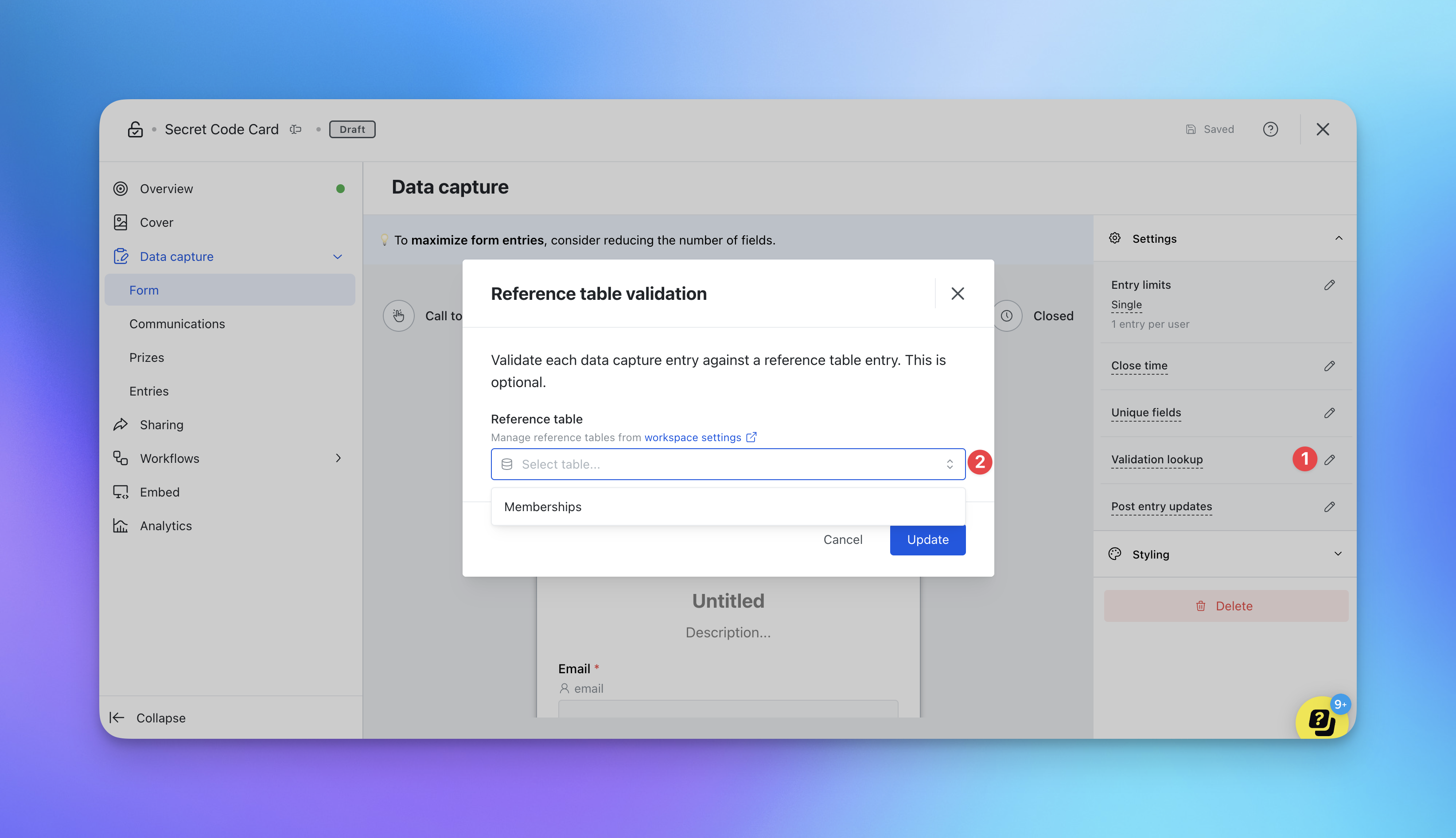• (2) Using the drop down, select the reference table to connect to the data capture.
