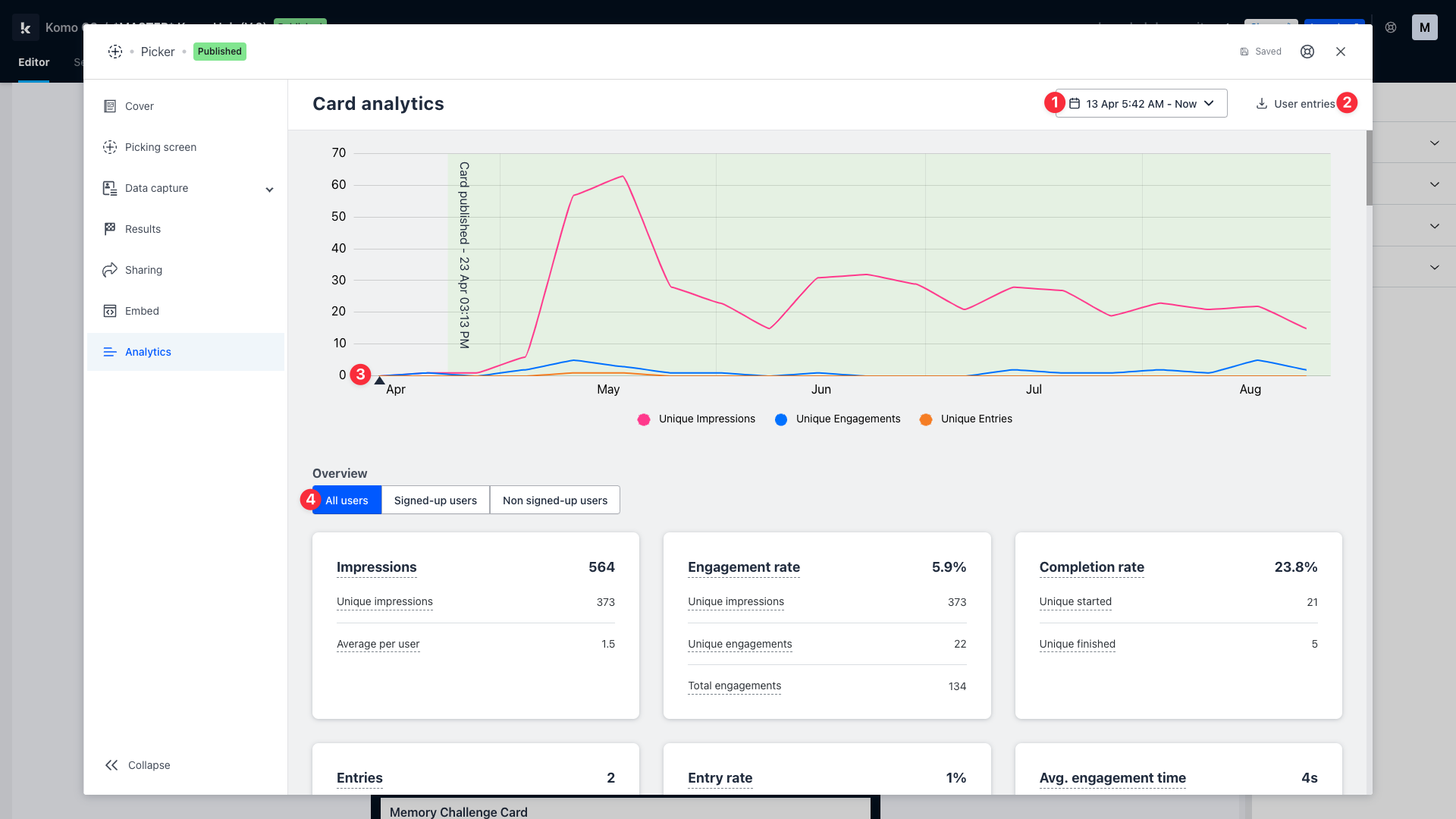 • (4) Here, you can choose to filter your analytics by all users, signed-up users or non-signed-up users