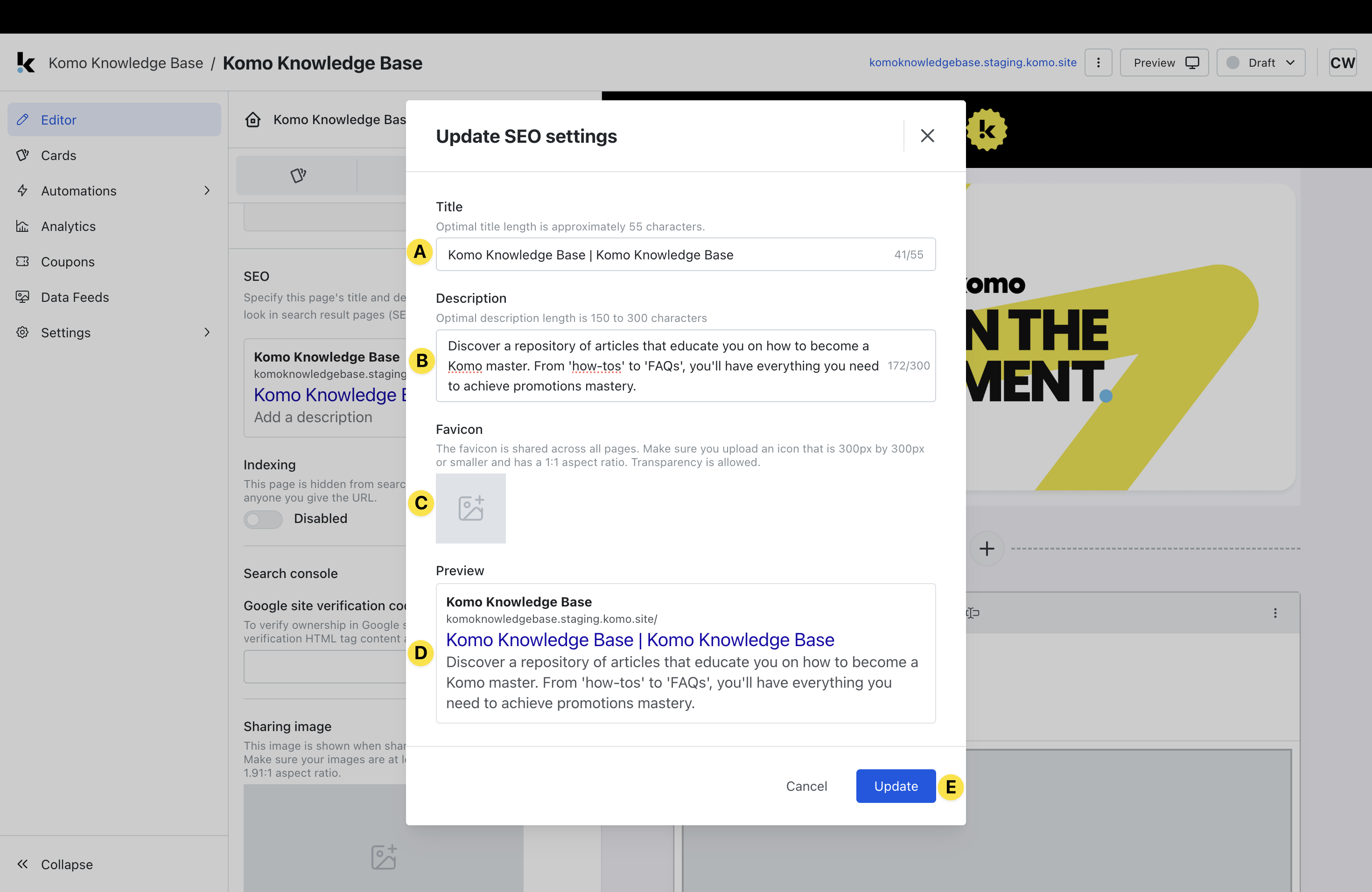 - (A) Here you can edit your ** Title**so that it is an optimal length for SEO purposes.