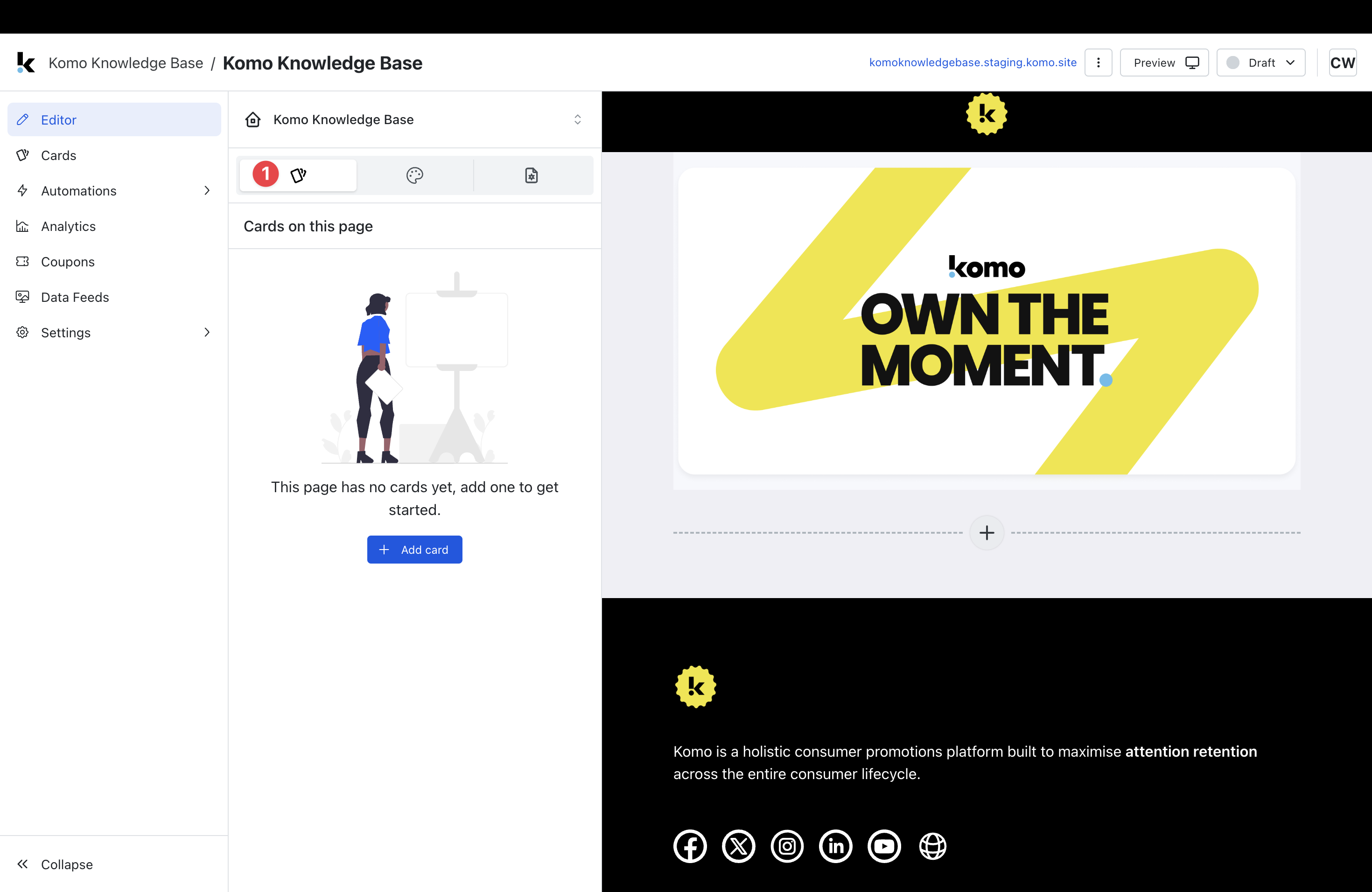 The Hub Editor gives you the ability to create Cards on pages, customise the overall look and feel and edit page-specific settings.How do I use it?