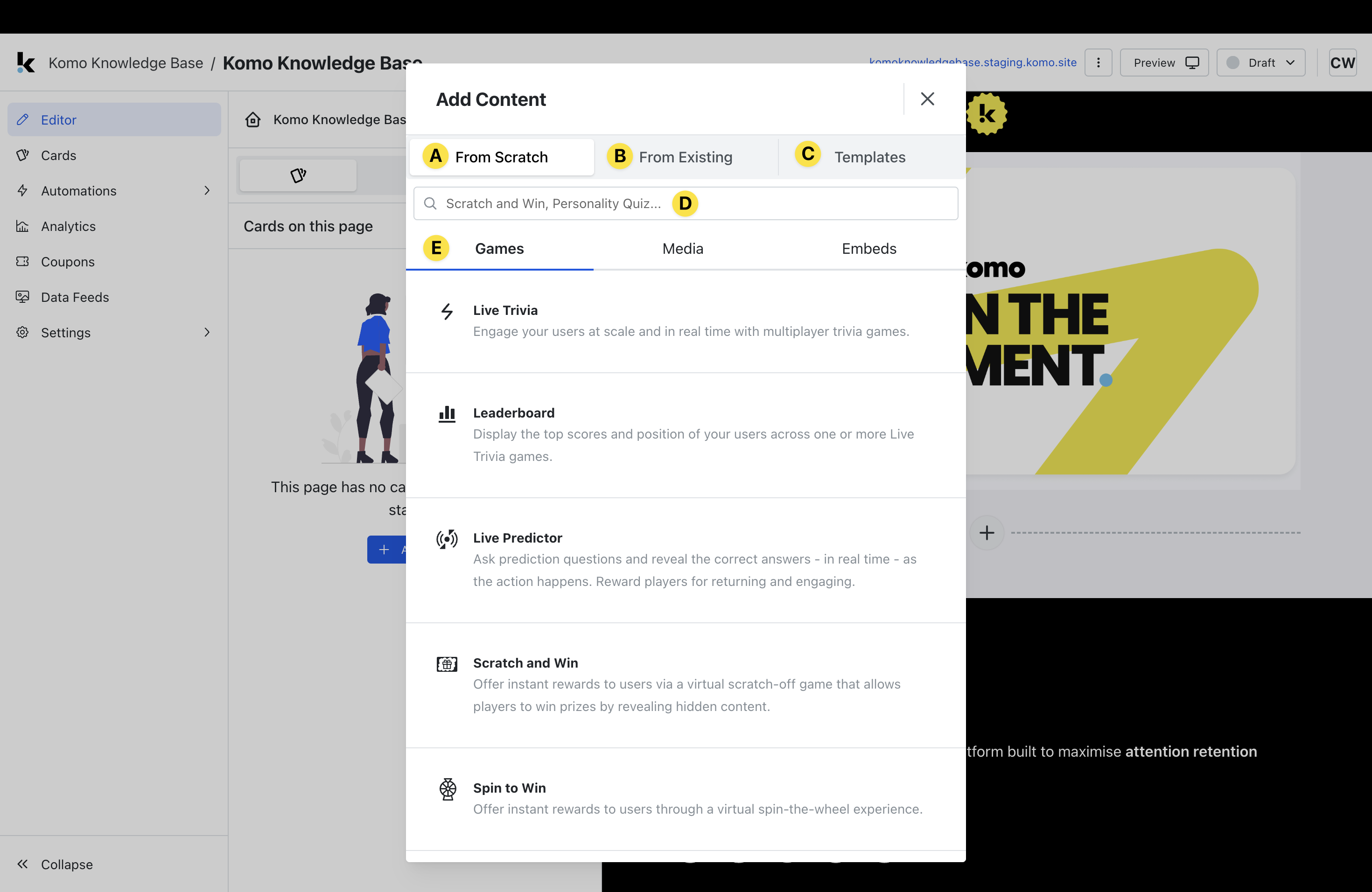 - (E) Here, you can scroll through all available Cards, including ** Games, Media,and ** Embedsand select the option you wish to create.** Notes:**For comprehensive instructions on the creation of all available Cards, please access the detailed articles in the Content section of this knowledge base.