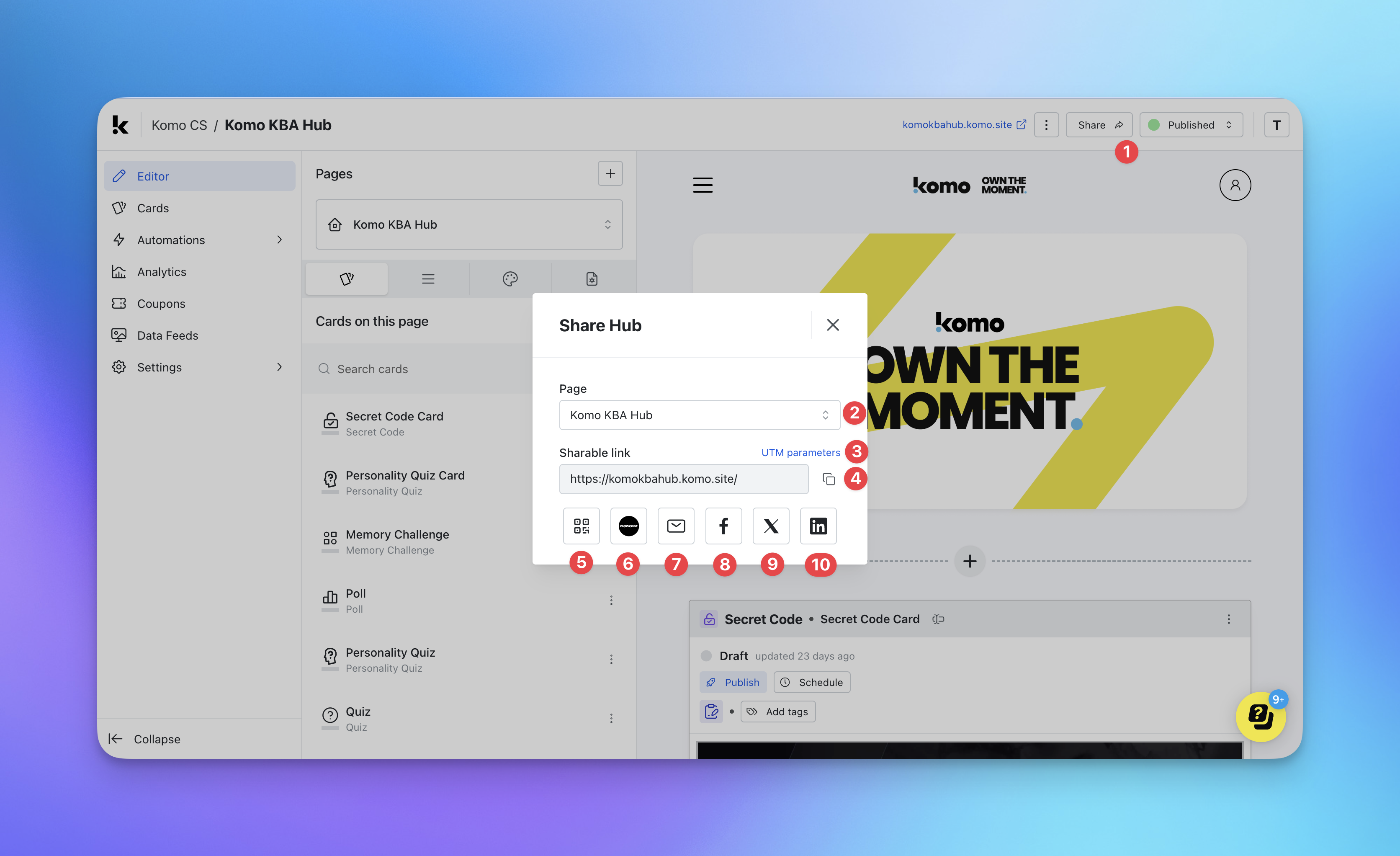 You can now share your Hub directly to your social accounts, through email, with a link or QR code.How do I use it?