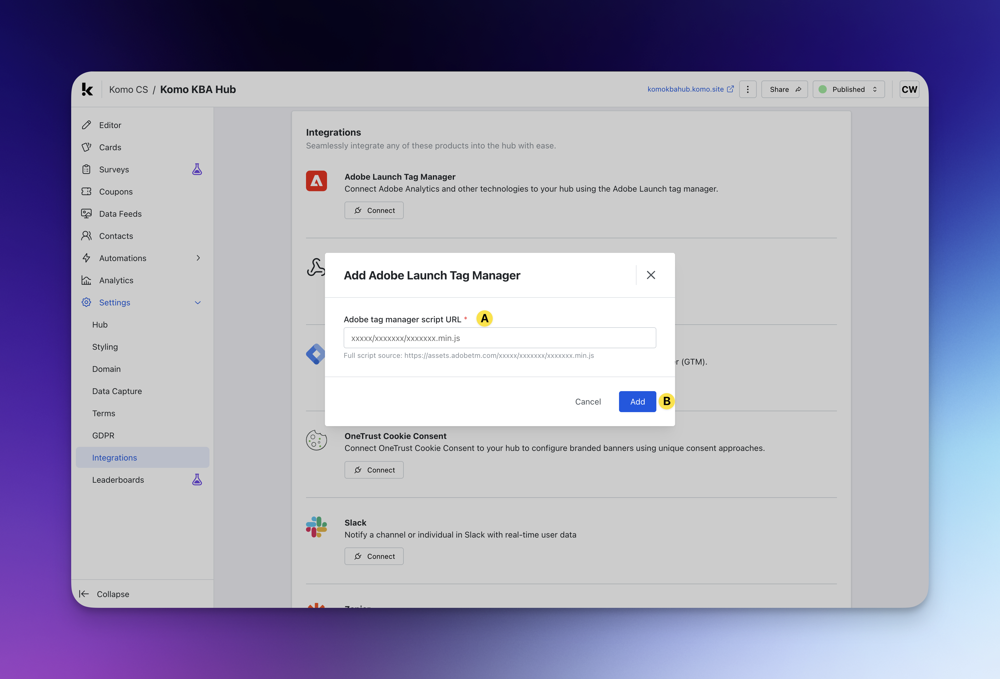 Integrations are what we define as another piece of software that you can connect to the Komo Platform in order to perform a specific action - these are built into our Platform. For example, here is a selection of the available built-in integrations on the Portal and their functions:- Adobe Launch Tag Manager - Connect Adobe Analytics and other technologies to your hub using the Adobe Launch tag manager.