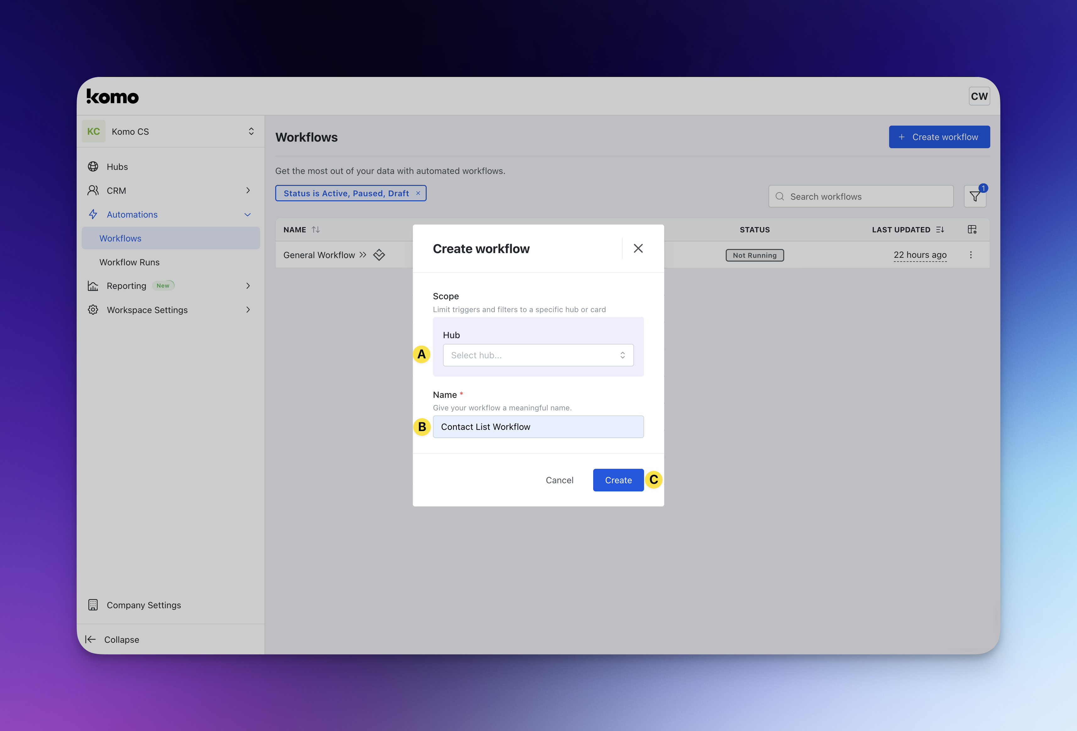 - (A) Here you can select if you would like your workflow to be connected to a specific Hub and Card. You can also leave this blank if you would like to create a global workflow that operates across all Hubs.