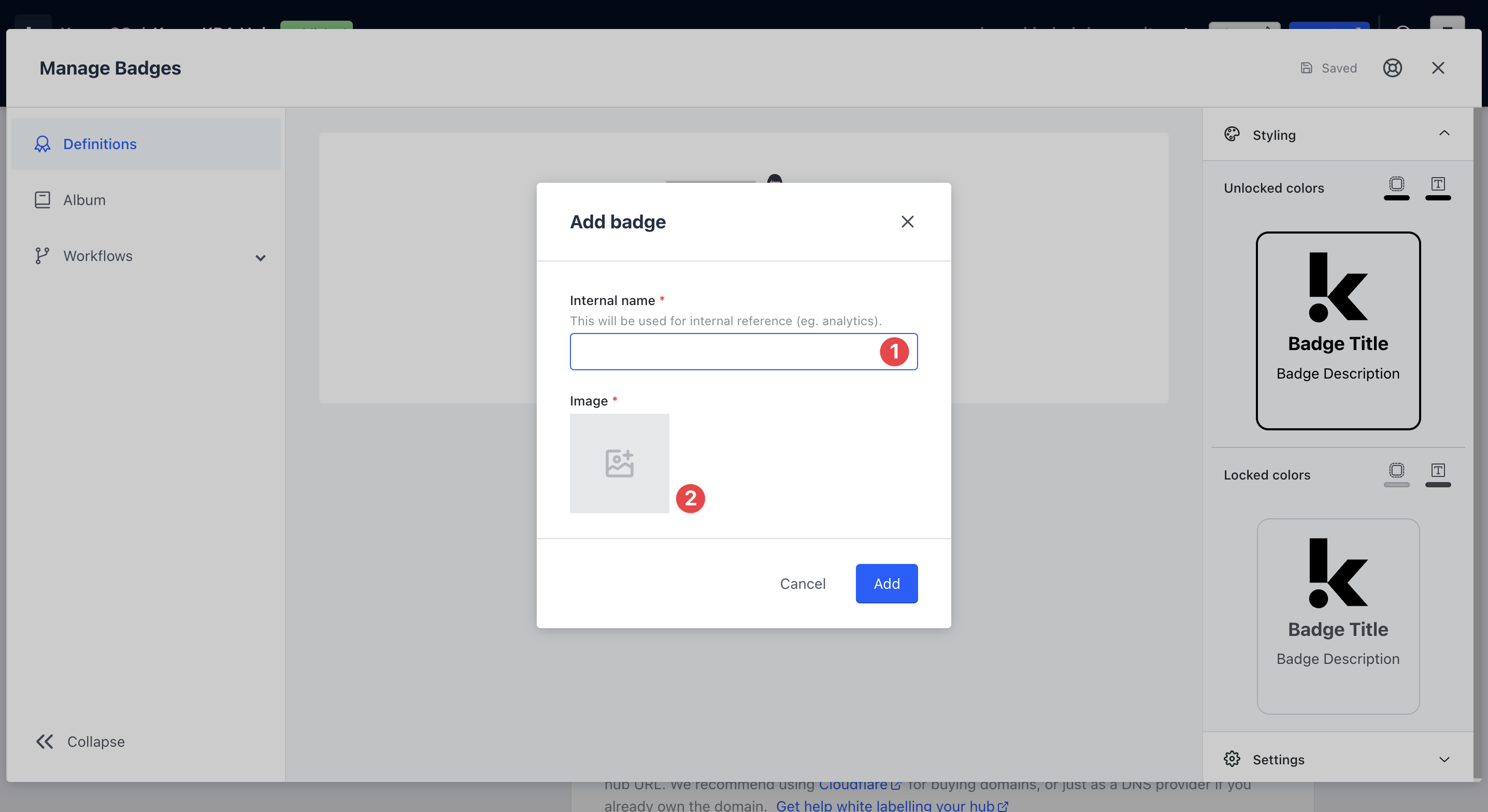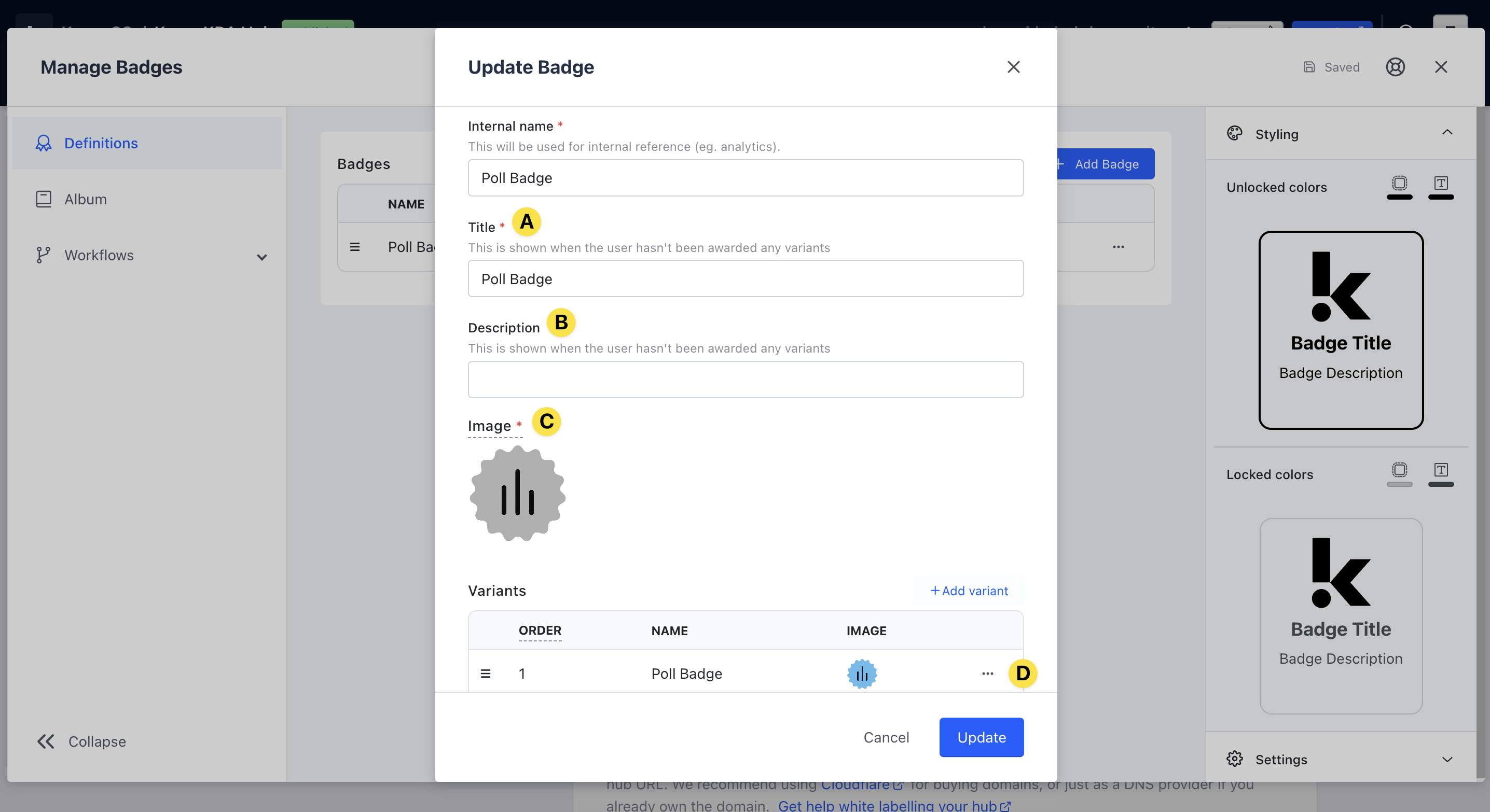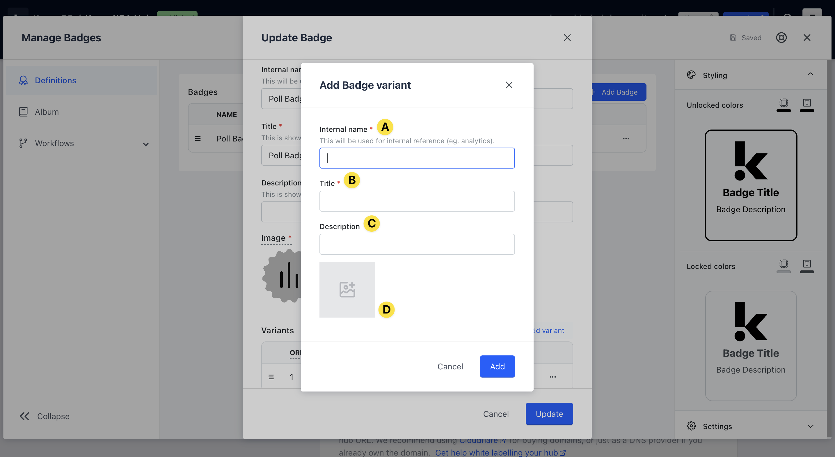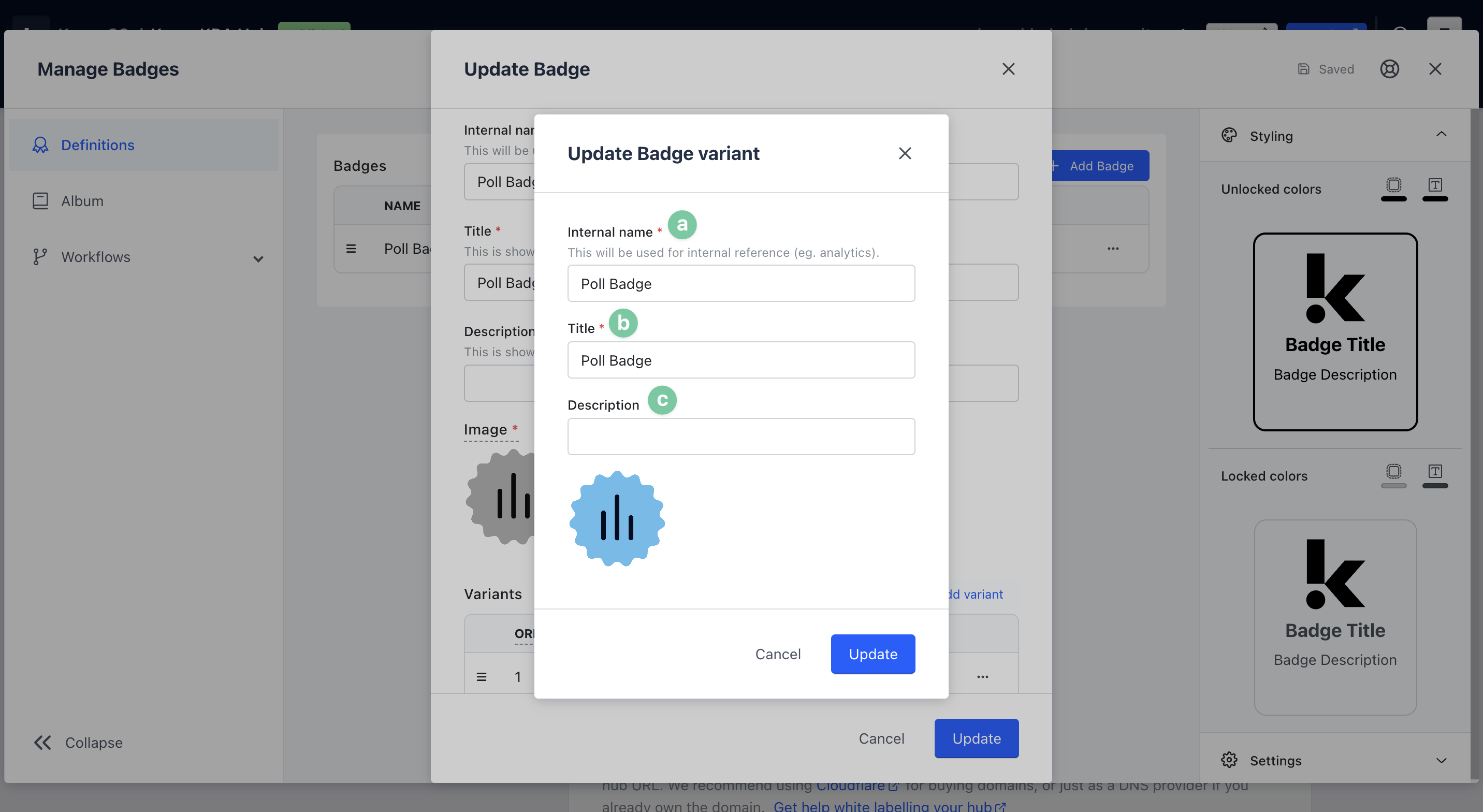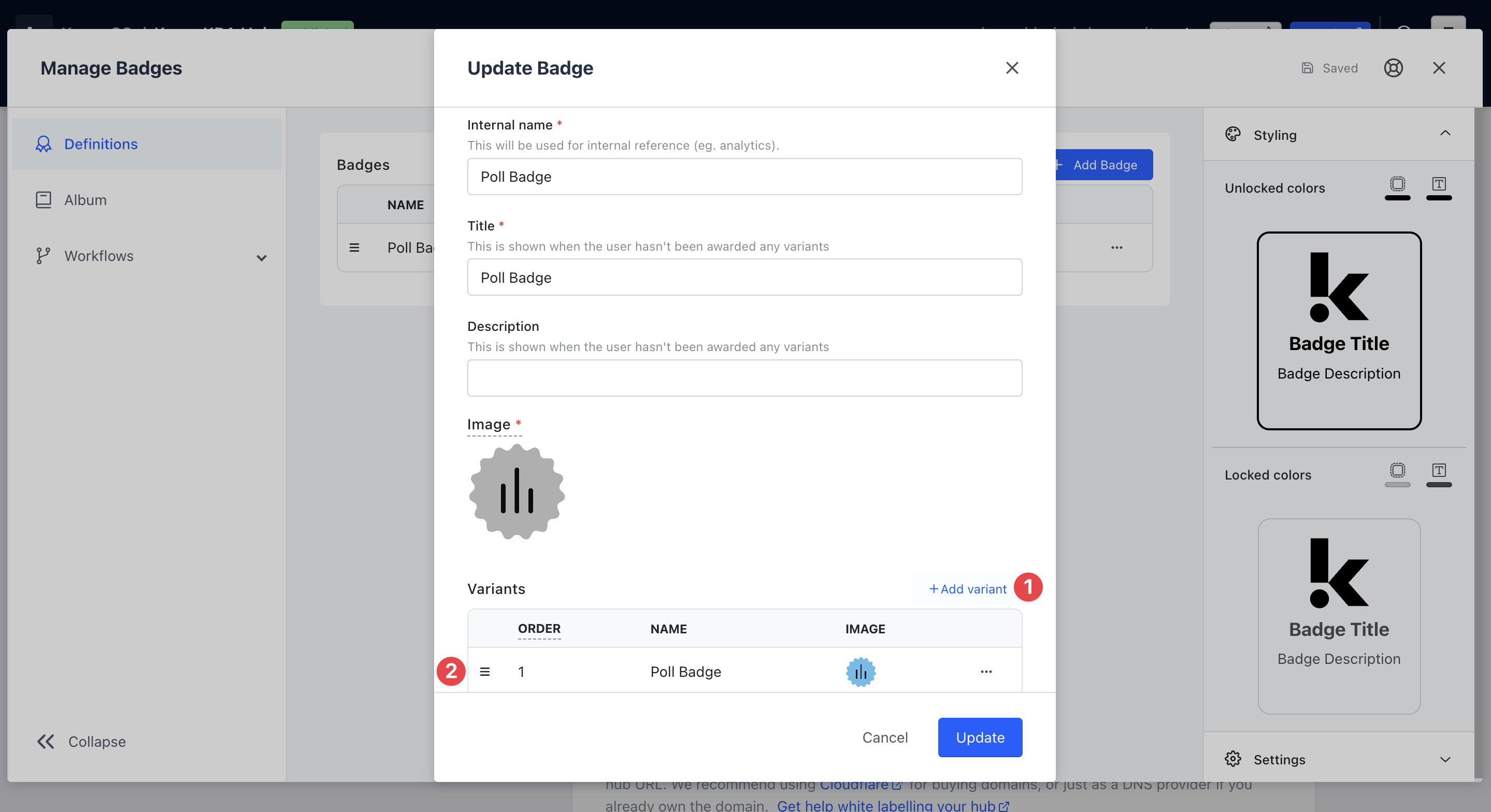 Should you wish to group certain Badges, under the Definitions tab, click on a Badge you’ve created and navigate to the Variants section of the modal.
