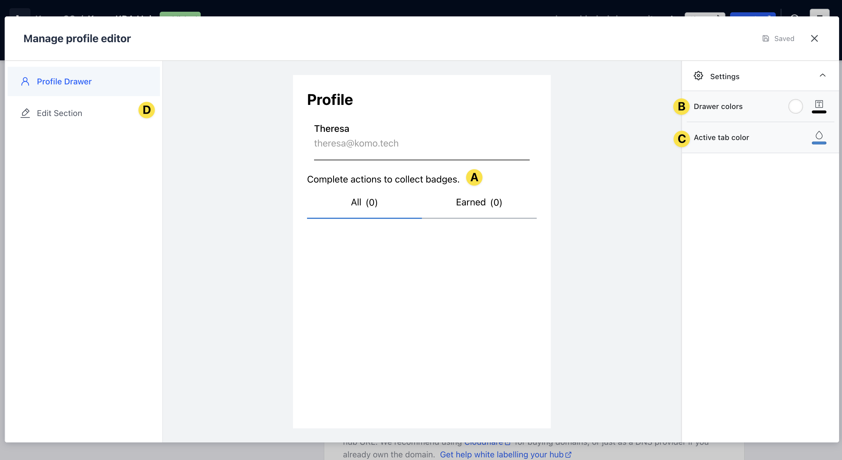 - (A) Here you can edit the messaging shown on the profile. Include instructions on what to do. For example, collect all badges to go in the running to win X!