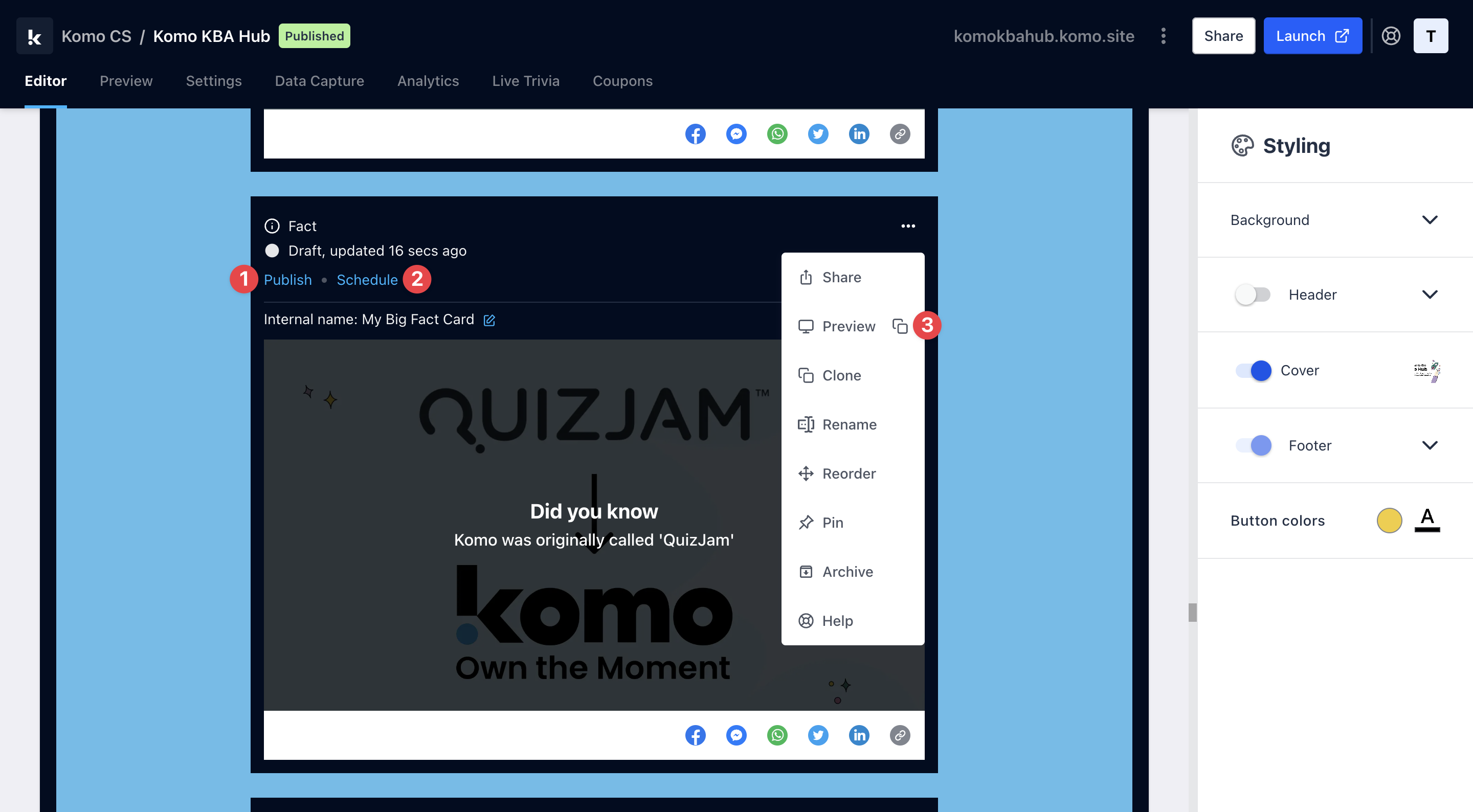 - (3) Click on … to Preview and interact with the card on the front end from a user’s perspective before publishing it. See how to test your card here.