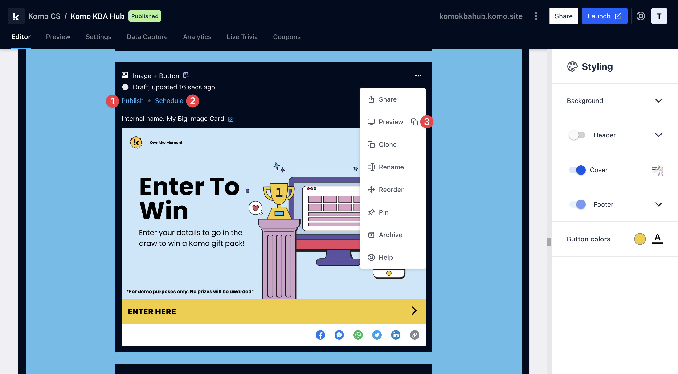 - (3) Click on … to Preview and interact with the card on the front end from a user’s perspective before publishing it. See how to test your card here.