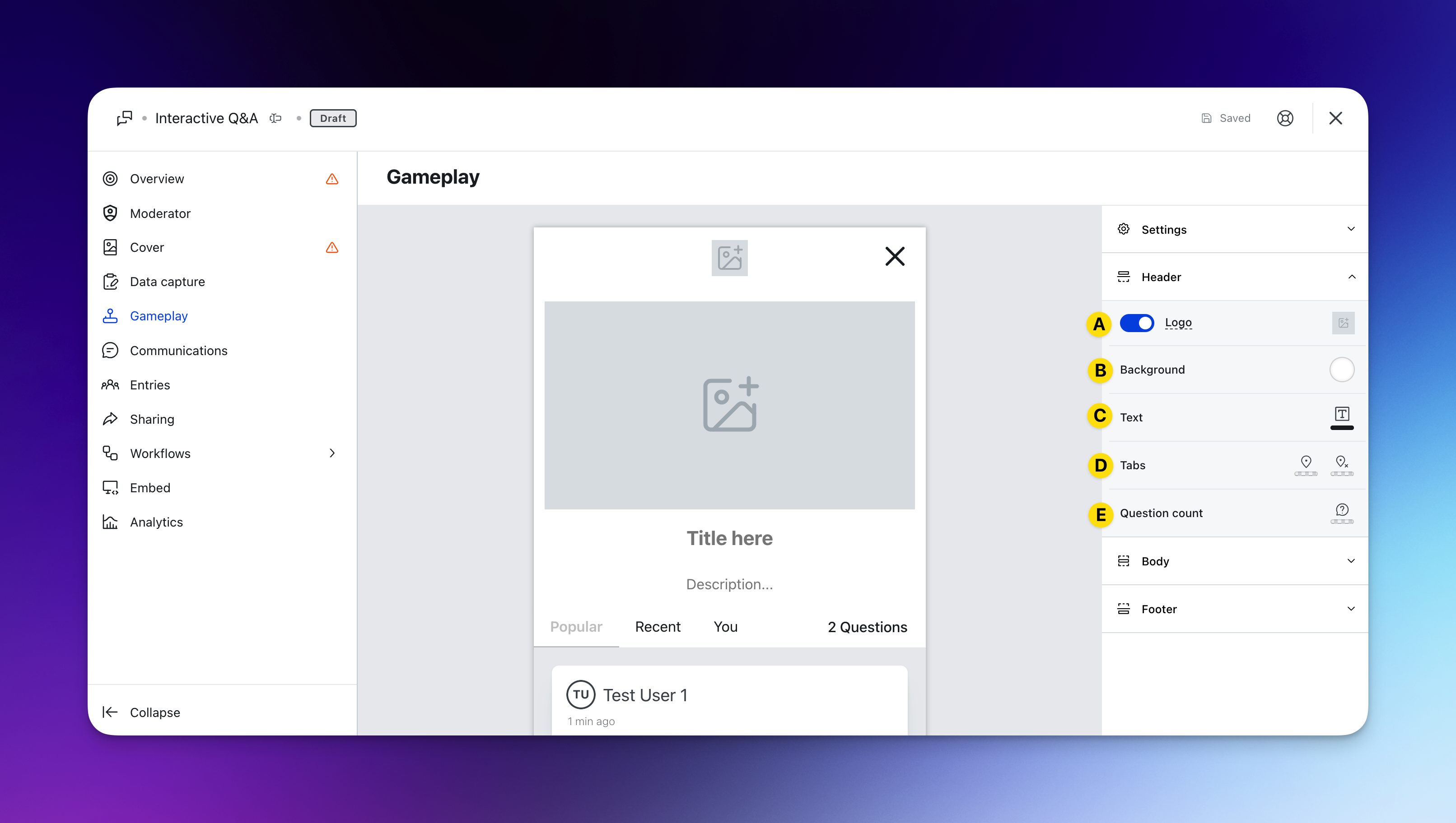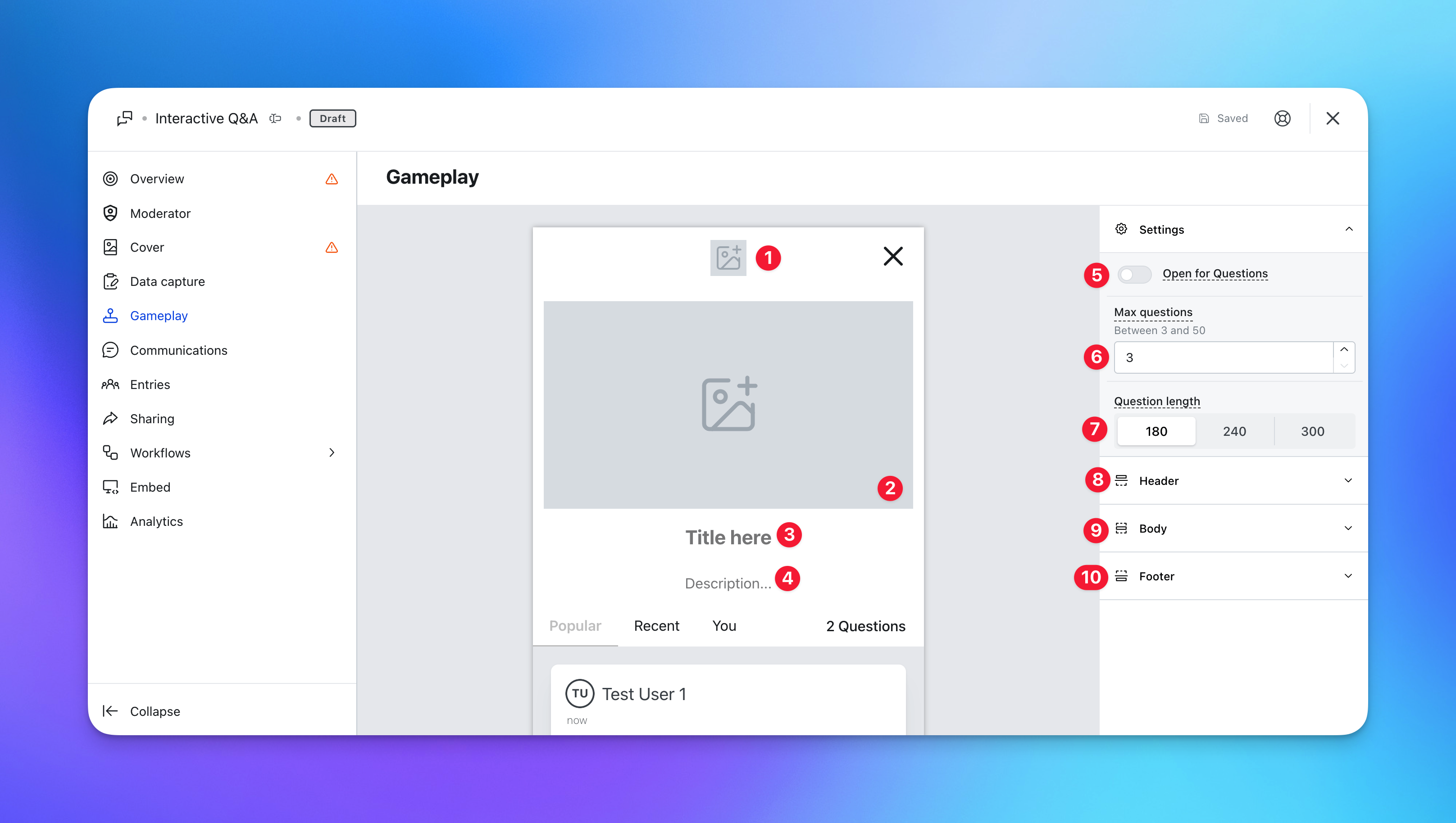 - (5) Navigate to the settings toolbar on the righthand side of the editing modal. Here you can toggle on or off the submitting of questions from your audience (more on this later!).