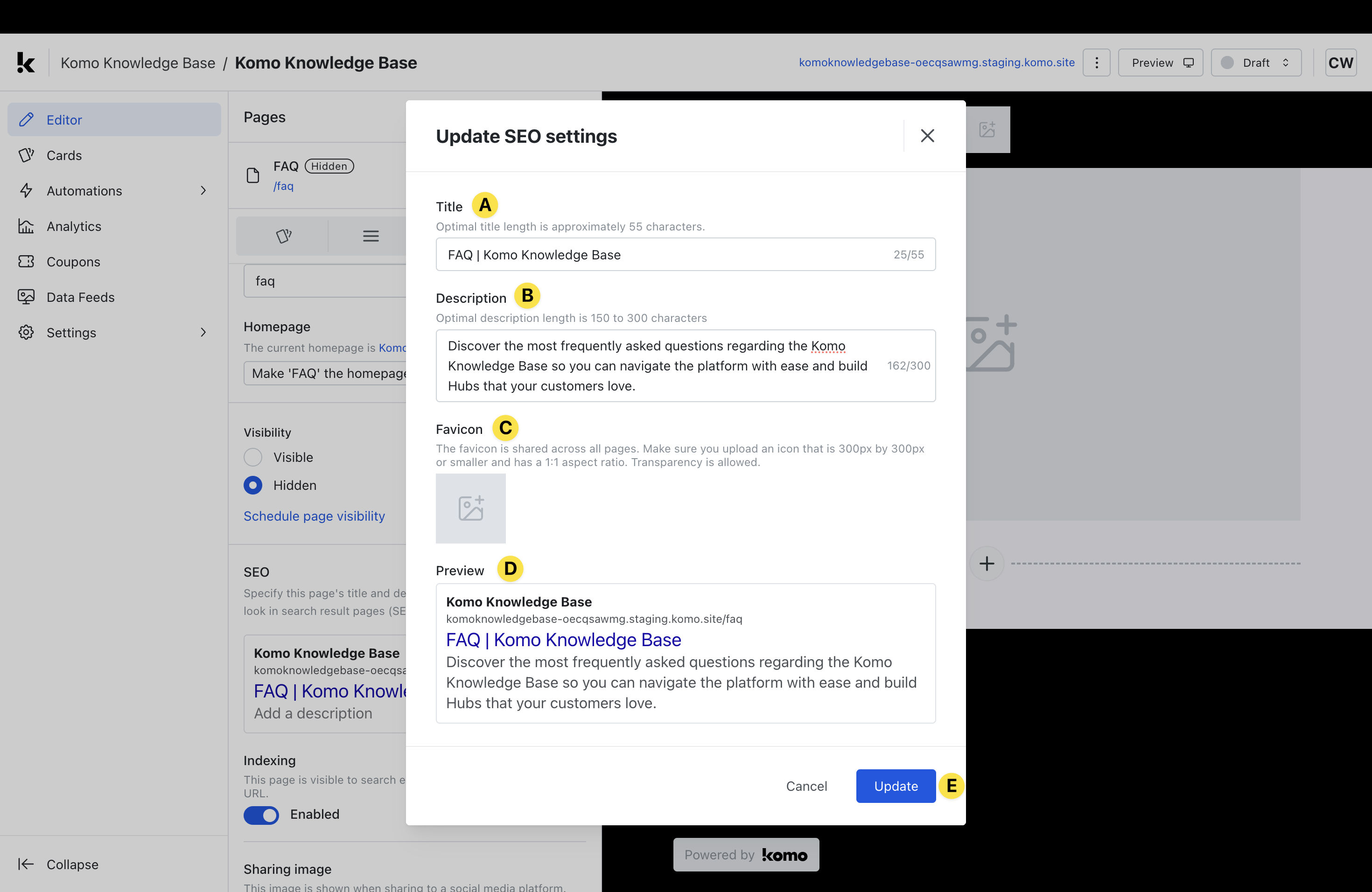 - (C) Upload a Favicon that will be displayed alongside the page listing in search engines. This is usually your brand logo or icon.