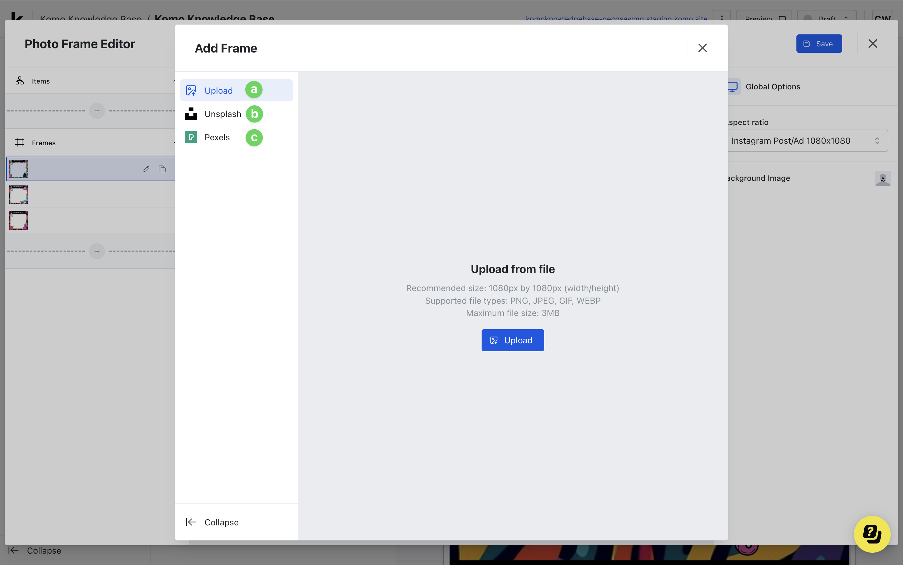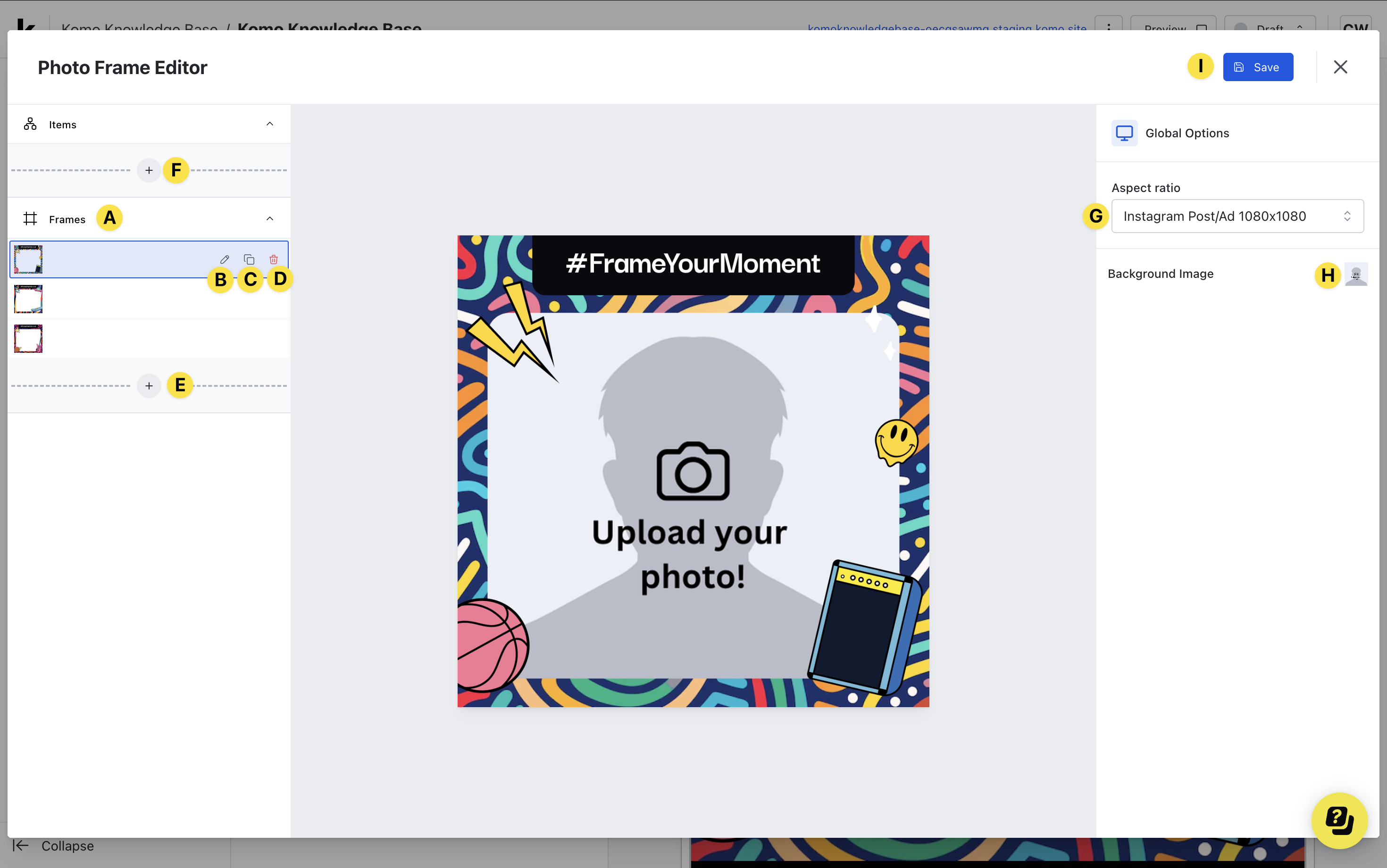 Make a ‘frame’ for your meme canvas. A frame will be a border you put around an image and here you can include your logo/imagery. This frame will be permanent, so when users upload a photo, the frame will be visible each time. A frame is great to include as when users share their creations, it will include your logo/imagery and help promote your brand.