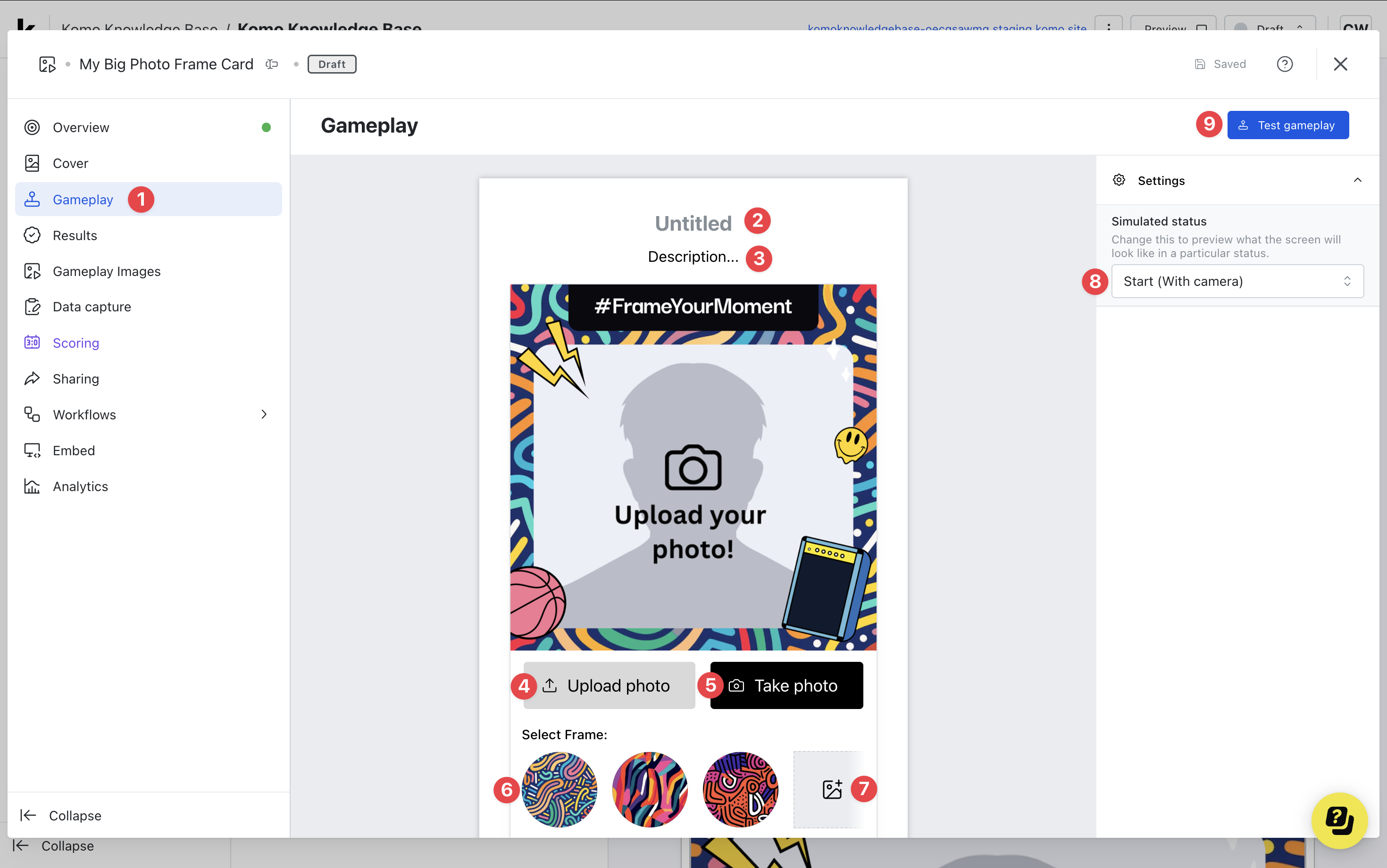 When a photograph is taken where is it stored? If you go under the Gameplay Images tab you will be able to review and download all images that have been created on your card, within this card you will also be able to review the details of the user that has uploaded their photo. Is there a way to see the number of creations made? If you click on the Analytics tab, you can see a breakdown of stats relating to the card. Alternatively, you can check the number of creations made by clicking on the Gameplay Images tab and scrolling down to the bottom. What’s the purpose of uploading multiple frames? Uploading multiple frames gives your end user more flexibility to choose the frame that best aligns with their taste. When uploading a photo or taking a selfie, the end user will be able to apply any of the frames that you have uploaded to the card. Can users take photos/selfies in the Photo Frame? Yes, they can! Users can take photos from their mobile, laptop, or computer.Top Tips