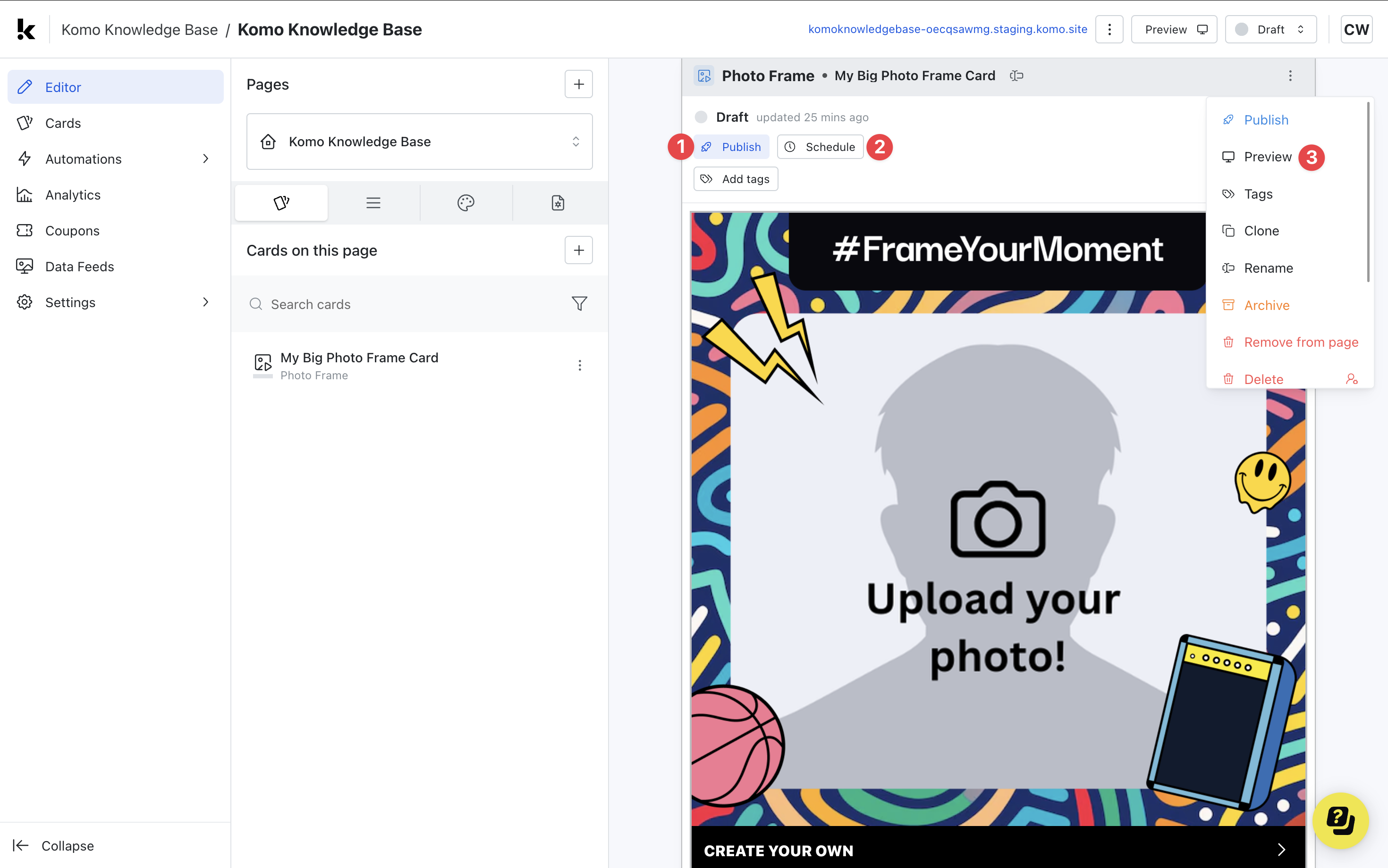 - (3) Click on … to Preview and interact with the card on the front end from a user’s perspective before publishing it. See how to test your card here.