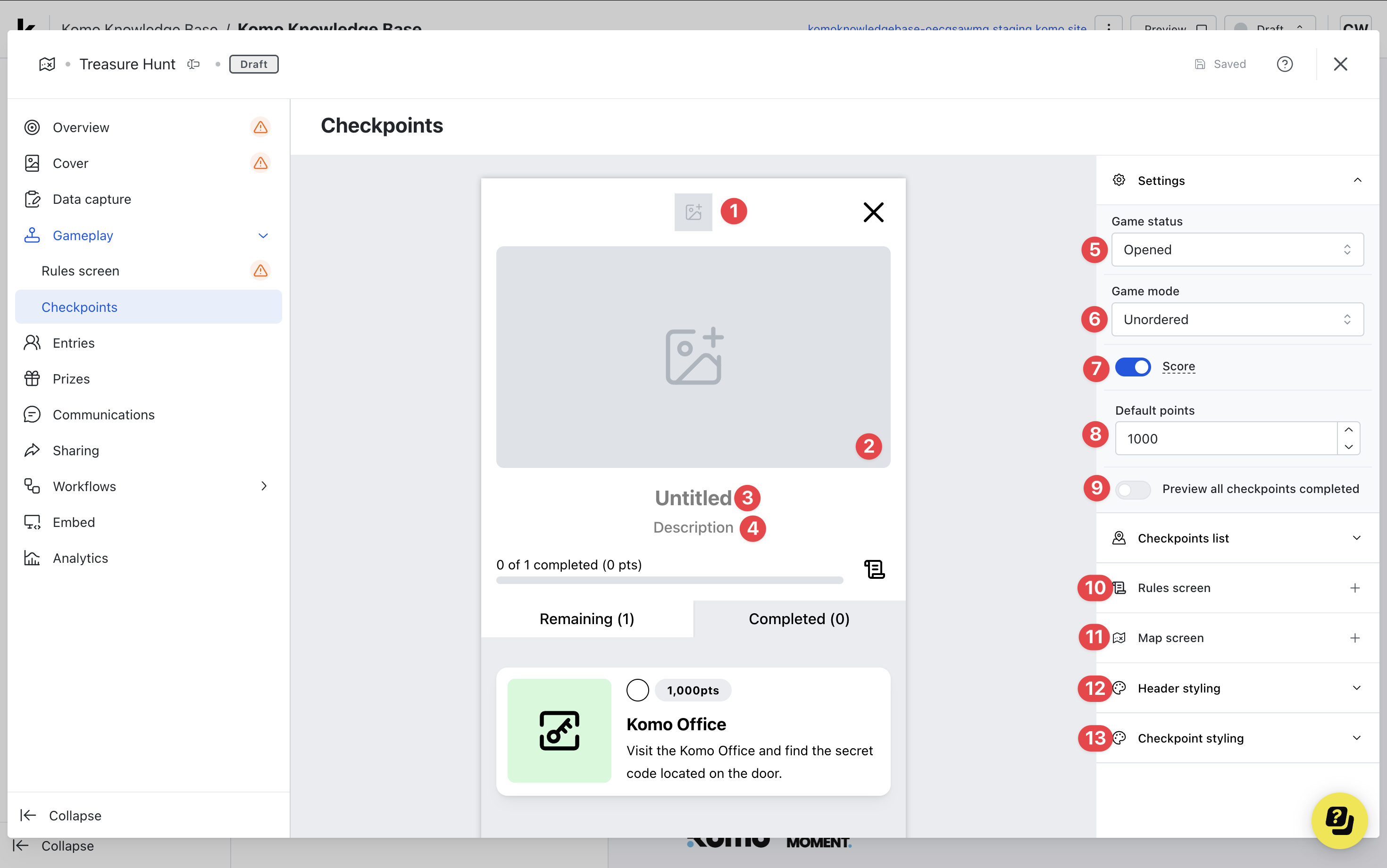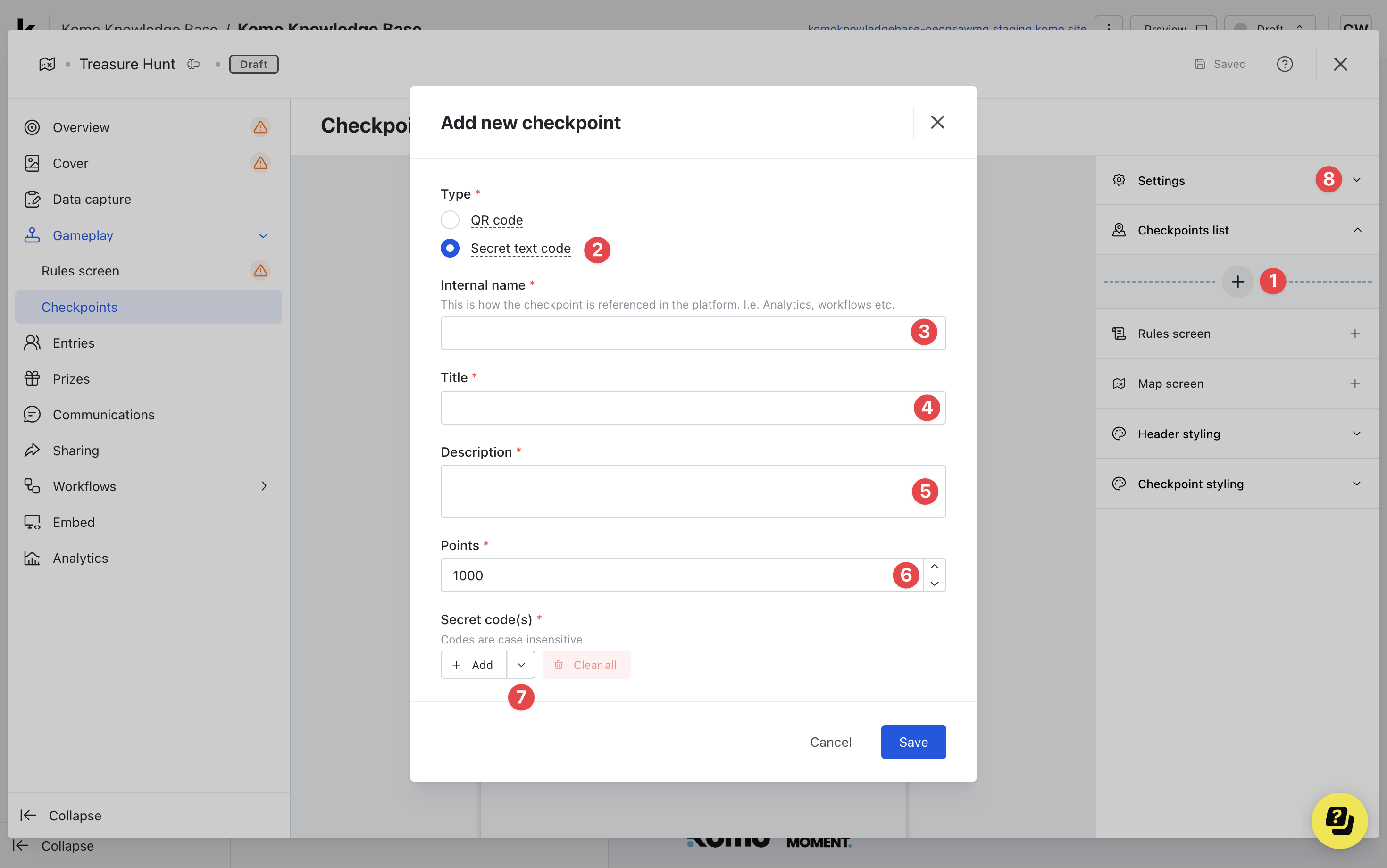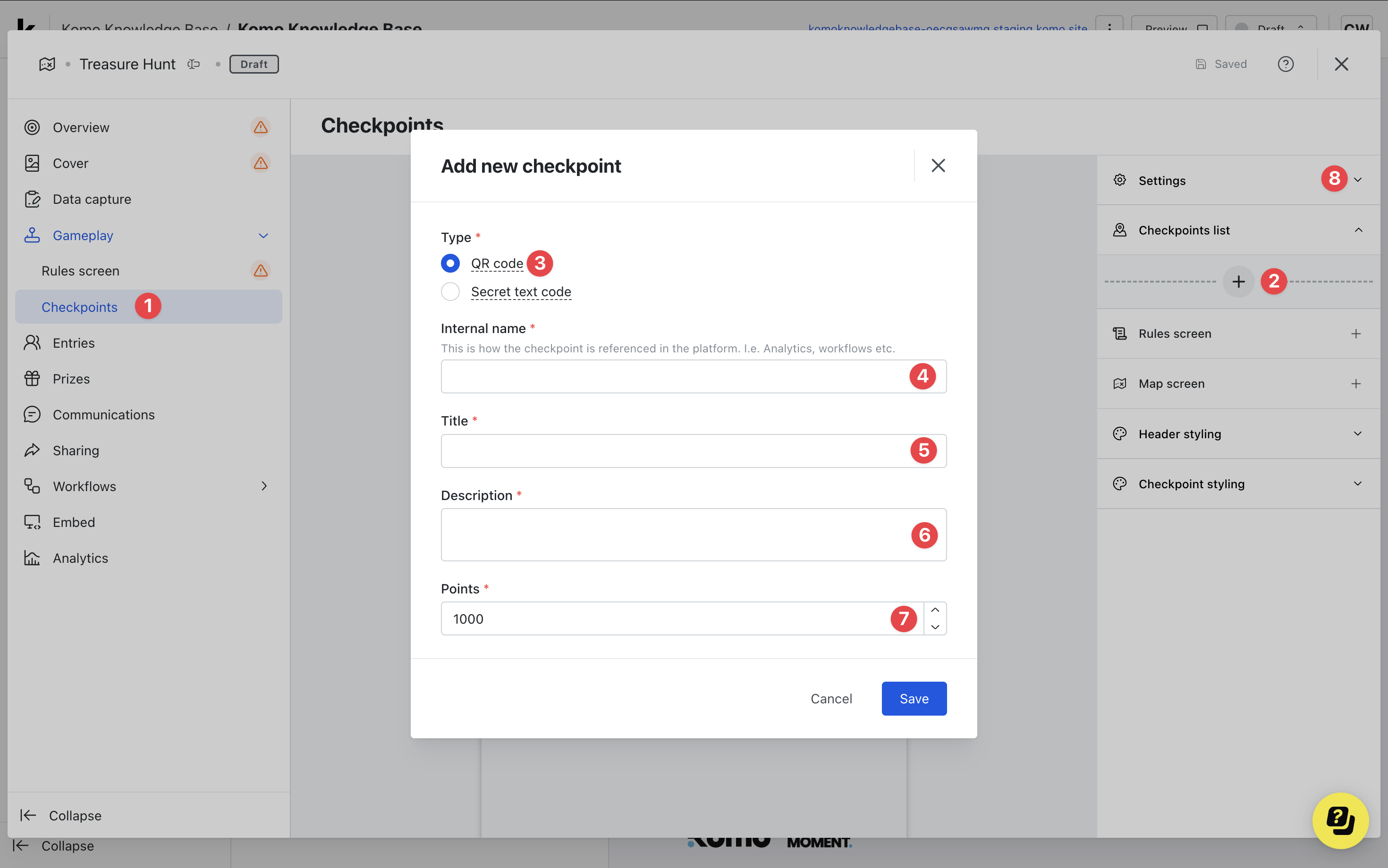 - (6) If you have points enabled, alter the number of points the checkpoint is worth or (8) you can disable the points in the settings.