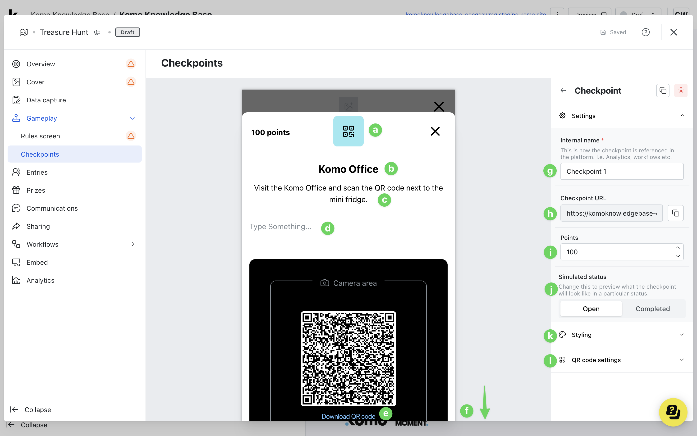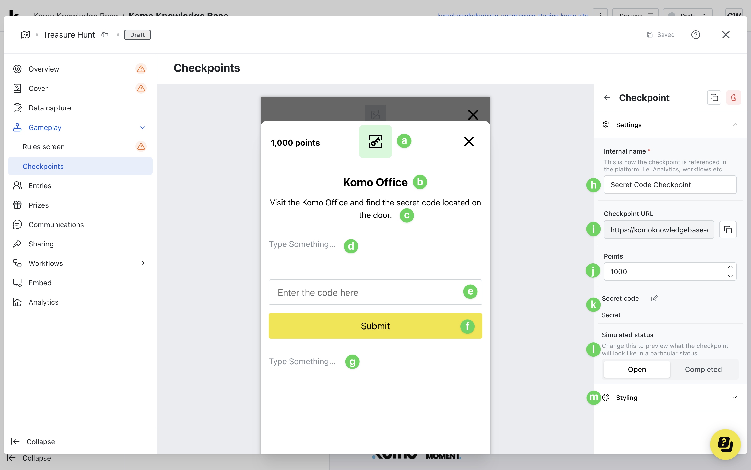 - (k) Here you can edit the secret code for the checkpoint.