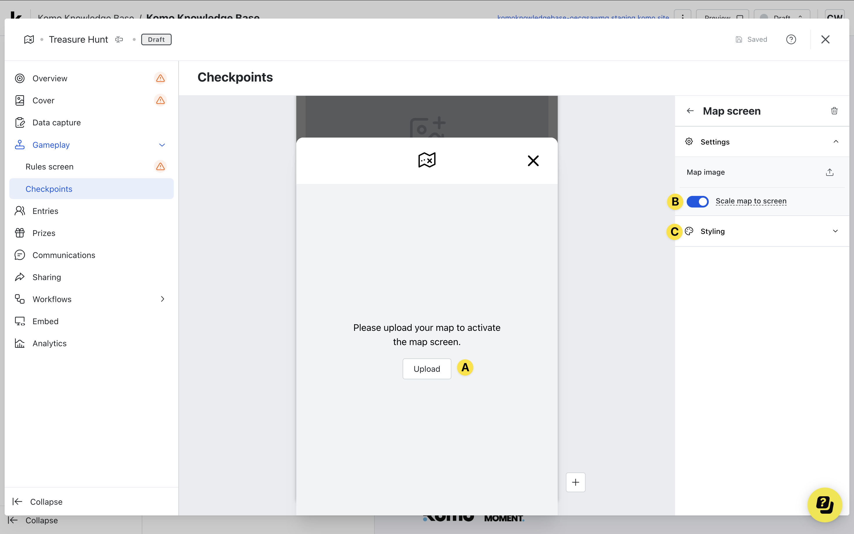 If you are directing users around a physical location, mark the areas to outline where the checkpoints are to help users navigate through the game. If you are running a digital scavenger hunt, you can move on to the next step.- (A) Here you can upload an image of the map.