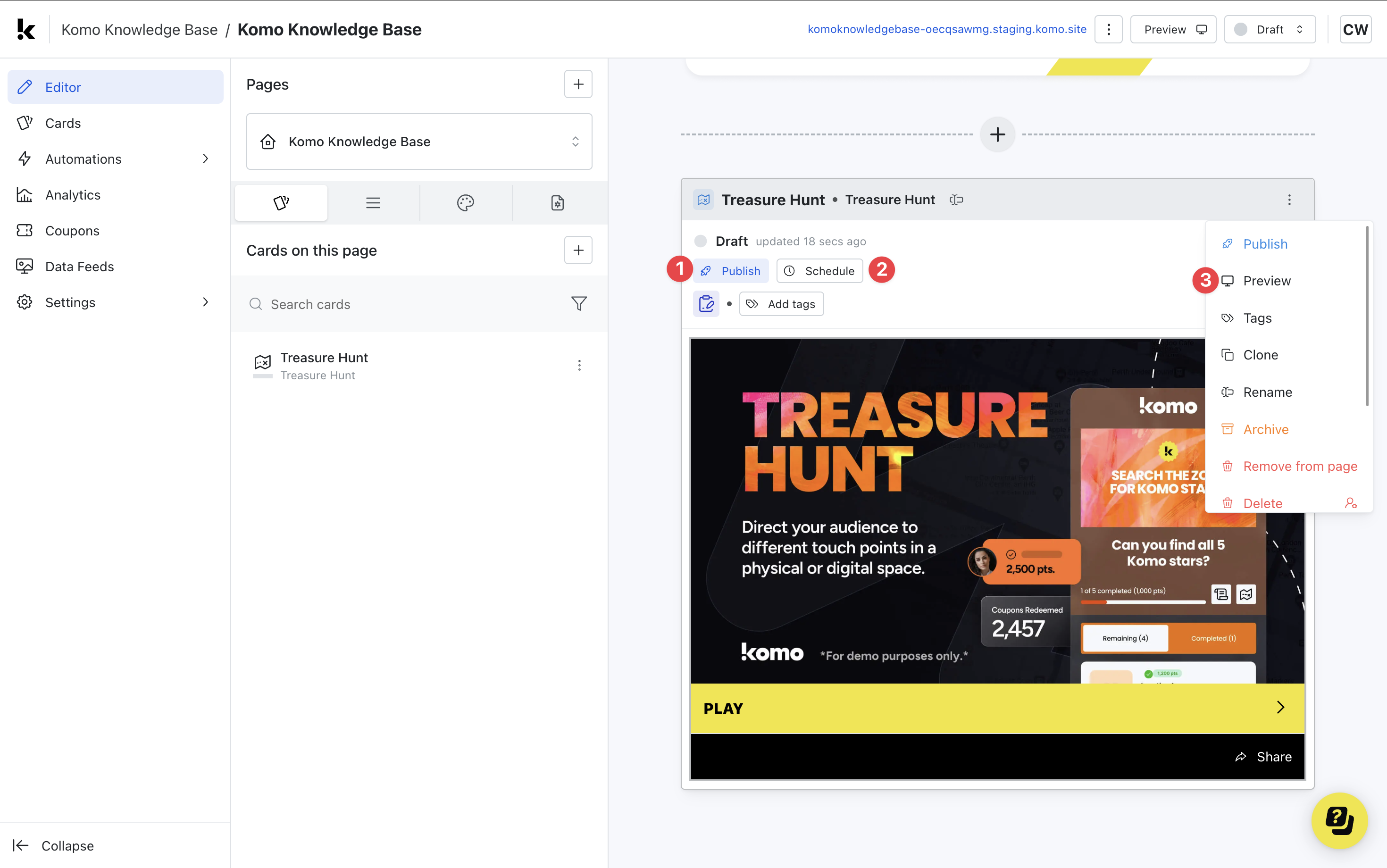 - (3) Click on … to Preview and interact with the card on the front end from a user’s perspective before publishing it. See how to test your card here.