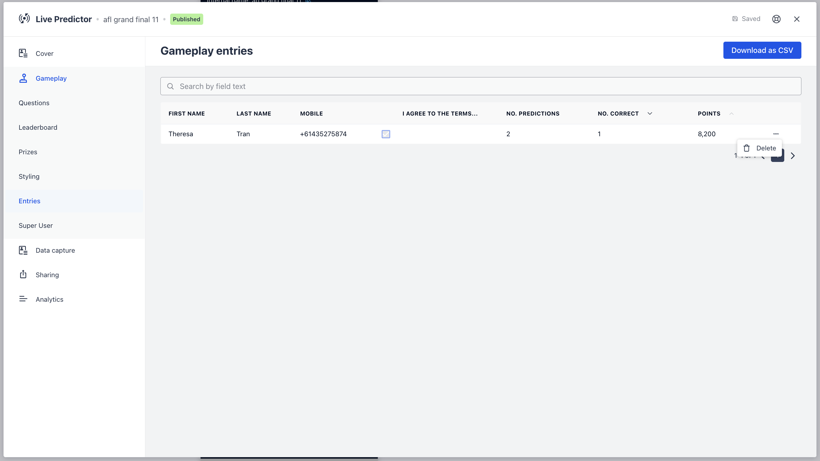 At any time during your event, you are able to view all entrant information under the Entries tab. The information in this section will be everything you requested in the Data capture form, the number of predictions each entrant has made, the total number of questions each entrant has got correct and their total points scored. You are also able to delete a user in this section by clicking the … icon. When you remove a user, it will delete all their details including current predictions and points. If they wish to enter the competition again, they can do so by re-entering their details, however, there will be no points associated with their new entry.