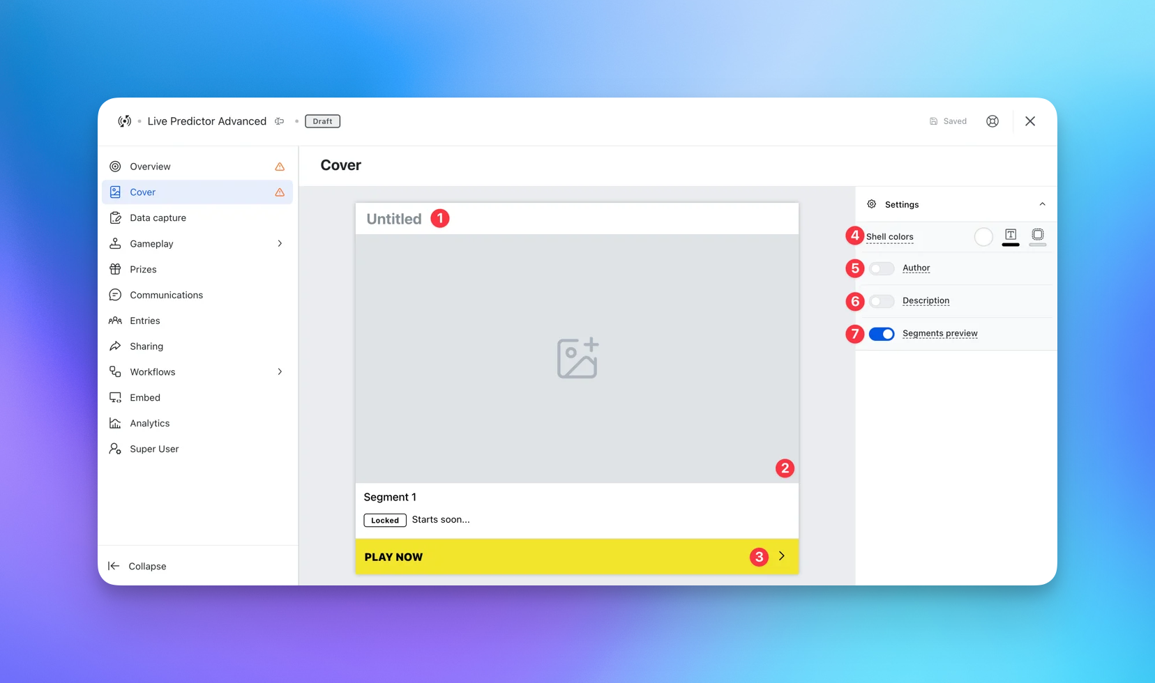 A segment simply refers to a portion of your event/events. e.g. for a sports game, a segment may be an individual quarter or if you’re running a season-long competition an individual game. For a reality TV show, one segment may be one episode. How you choose to break down your Live Predictor card is entirely up to you!- (1) Here you will need to name the segment. For instance, if you’re separating the segments by quarters you would name the segment “1st Quarter”.