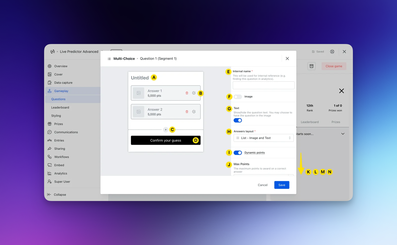 - (K) Here you can alter the starting point allocation for each of the different responses, Eg. By setting an answer at 80% it will provide 2,000 pts. You may decide to do this if you want to lower the awarded points by selecting the favourite. Once your card goes live, these point allocations will automatically fluctuate based on user responses.