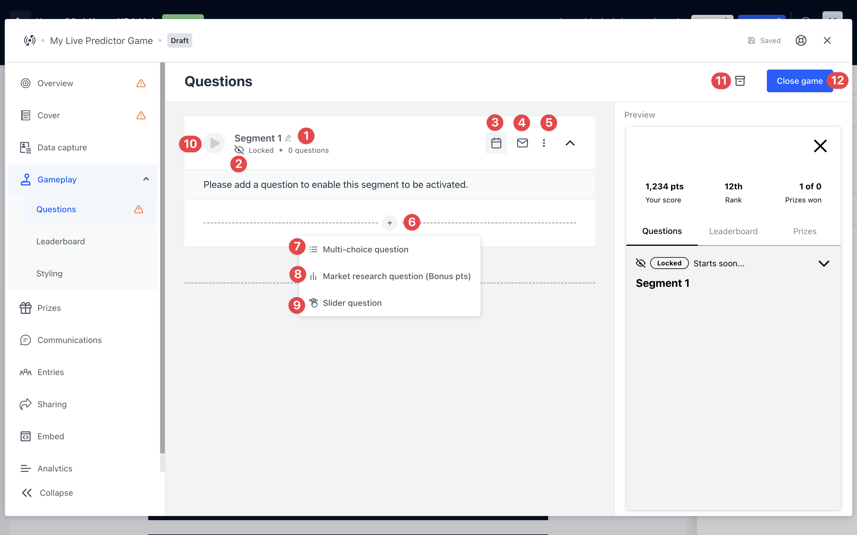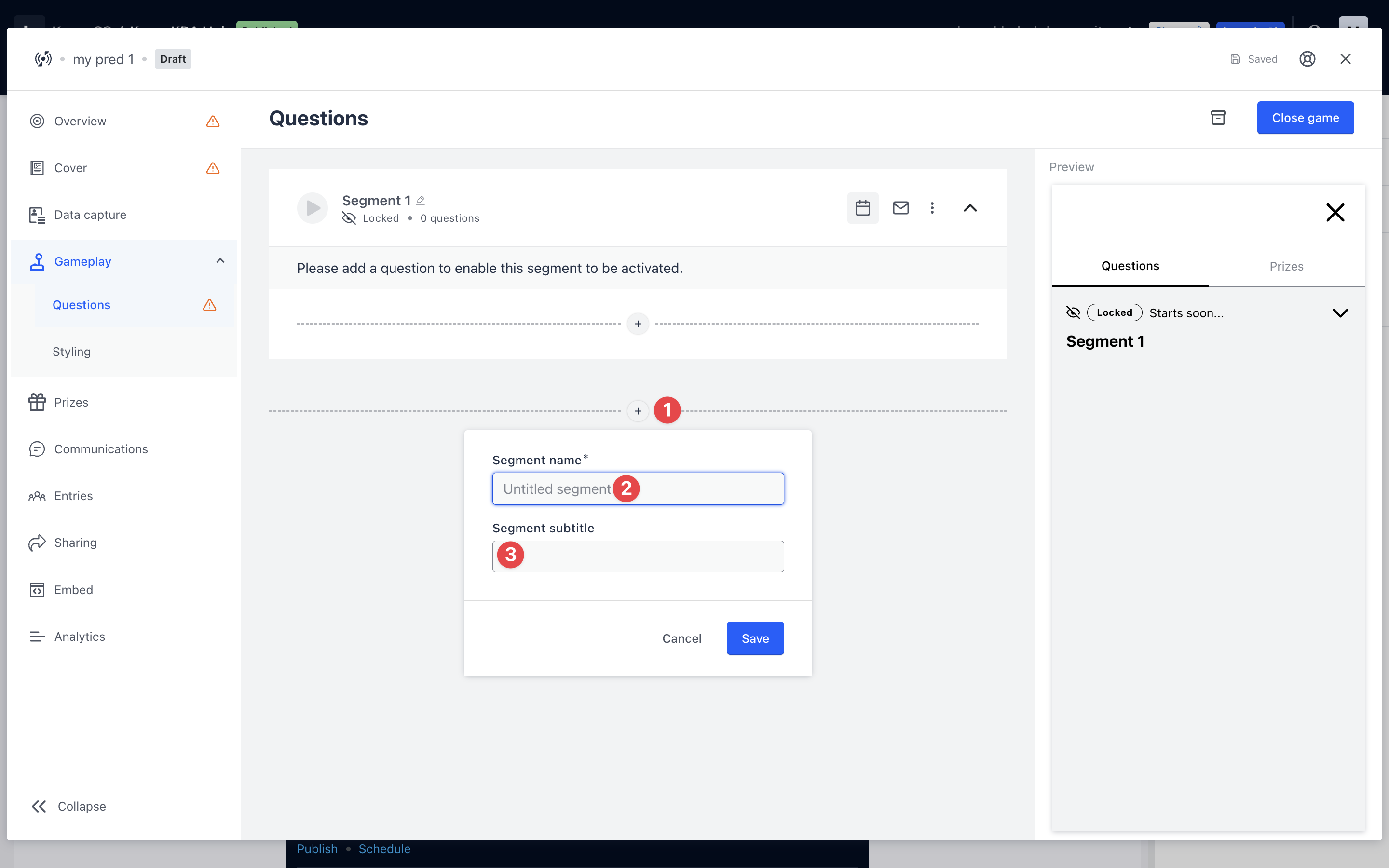 - Remember to close segments as particular games or events end. You can manually close segments or schedule them to close on a certain day and time. This is to prevent users from predicting questions that have already occurred.