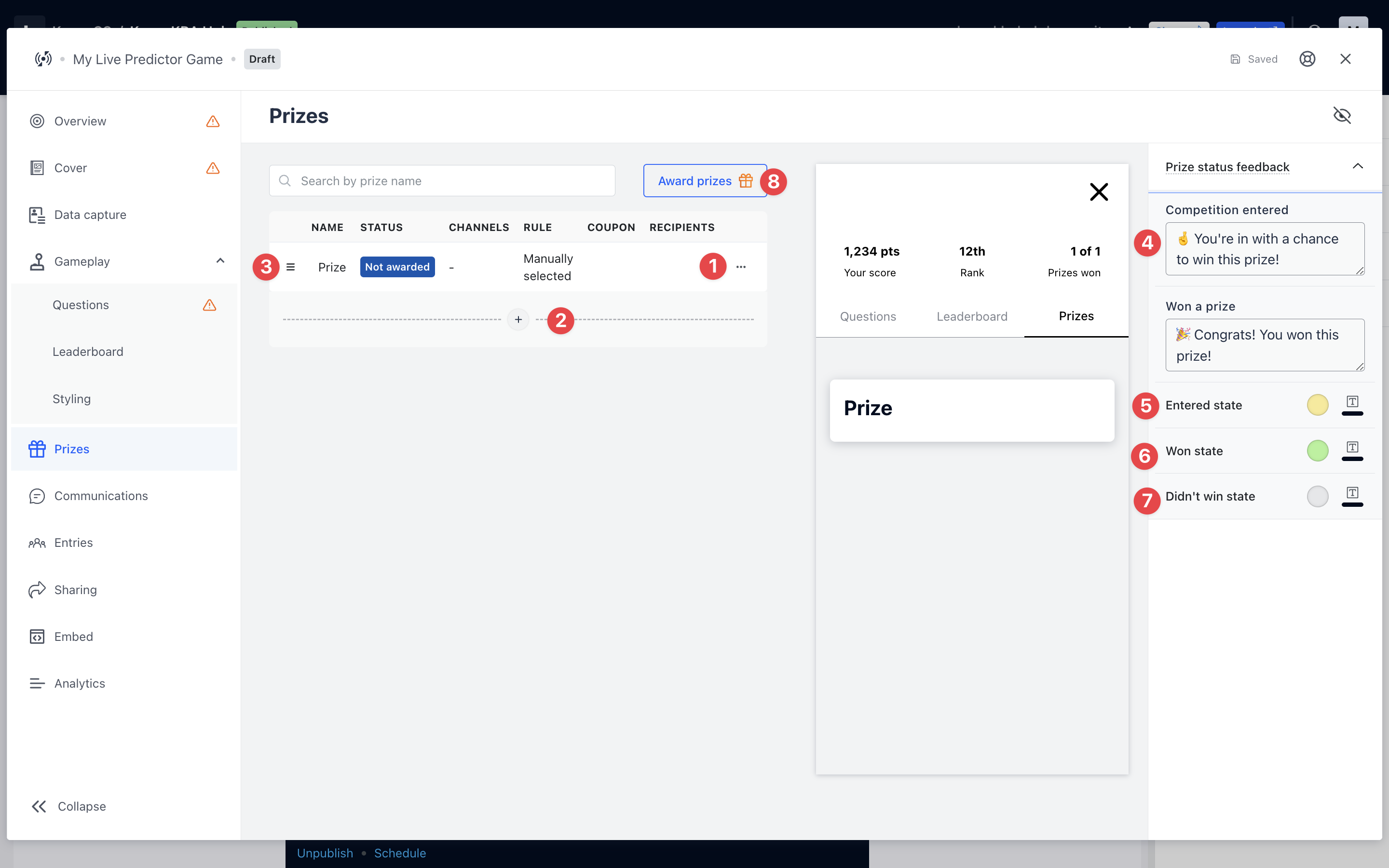 - Make sure to enable Live prize-awarding. You can do this by clicking the **… **icon next to the prize and selecting Enable prize awarding.