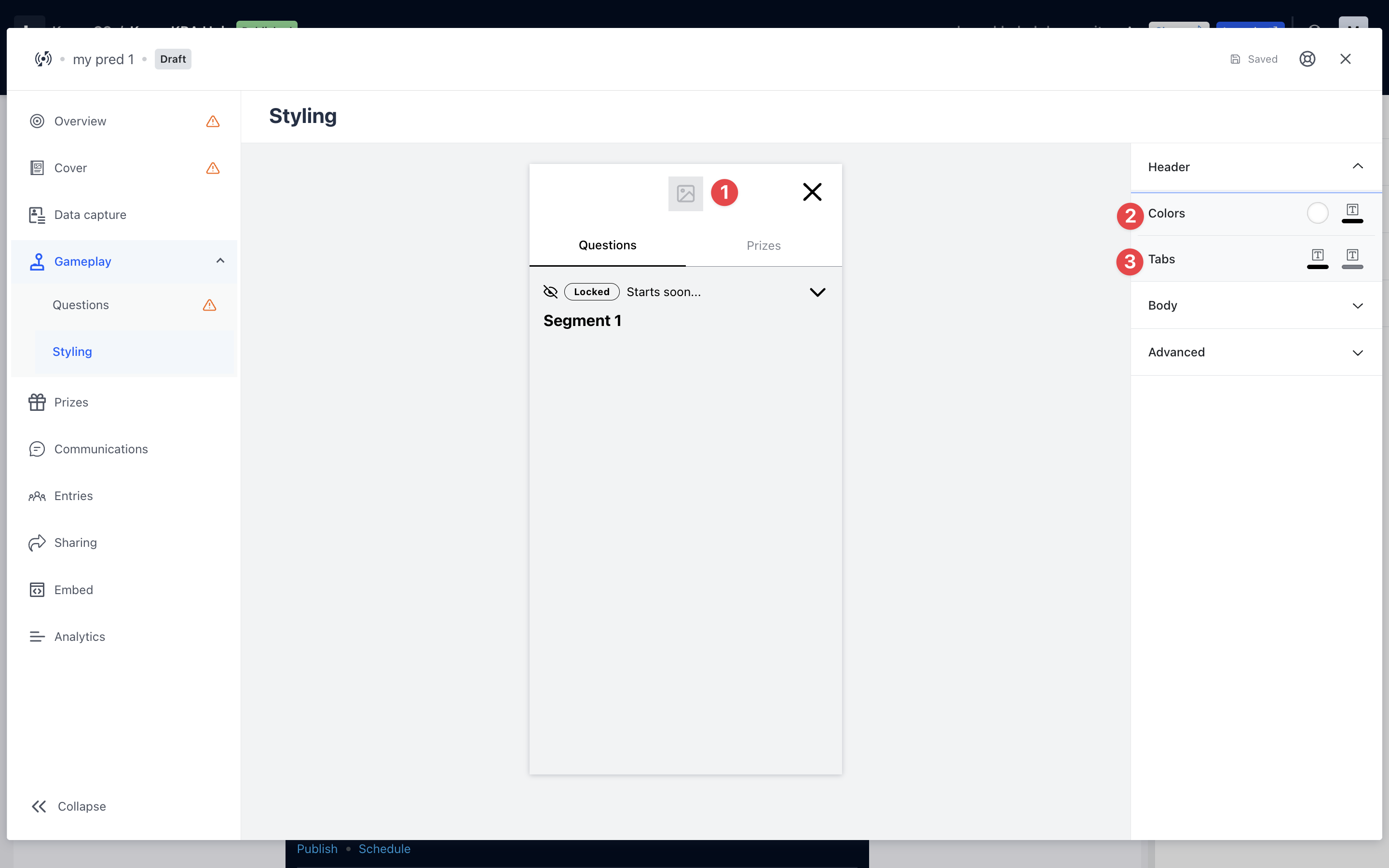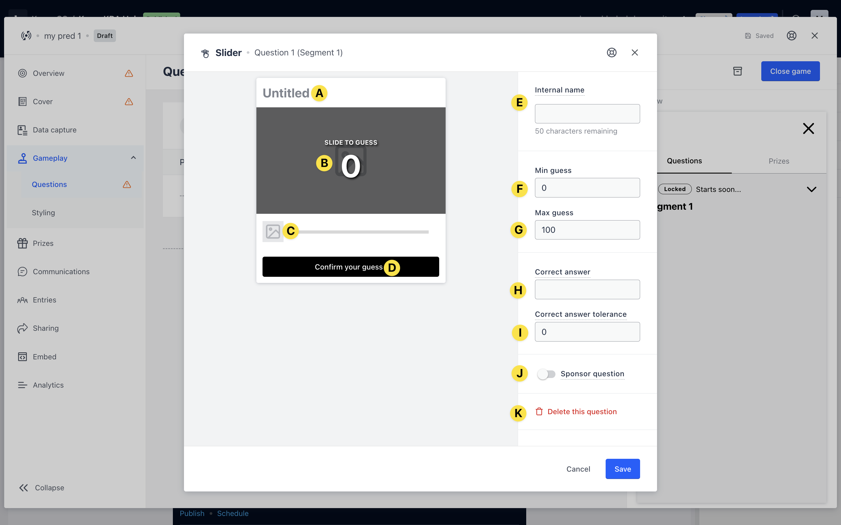 - If you have multiple segments, it is recommended to have at least 3 questions in each segment. If you have just one segment, look at having a minimum of 5 questions for maximum engagement. Include at least one survey and/or slider question. Allowing your audience to answer questions in different ways makes things interesting.