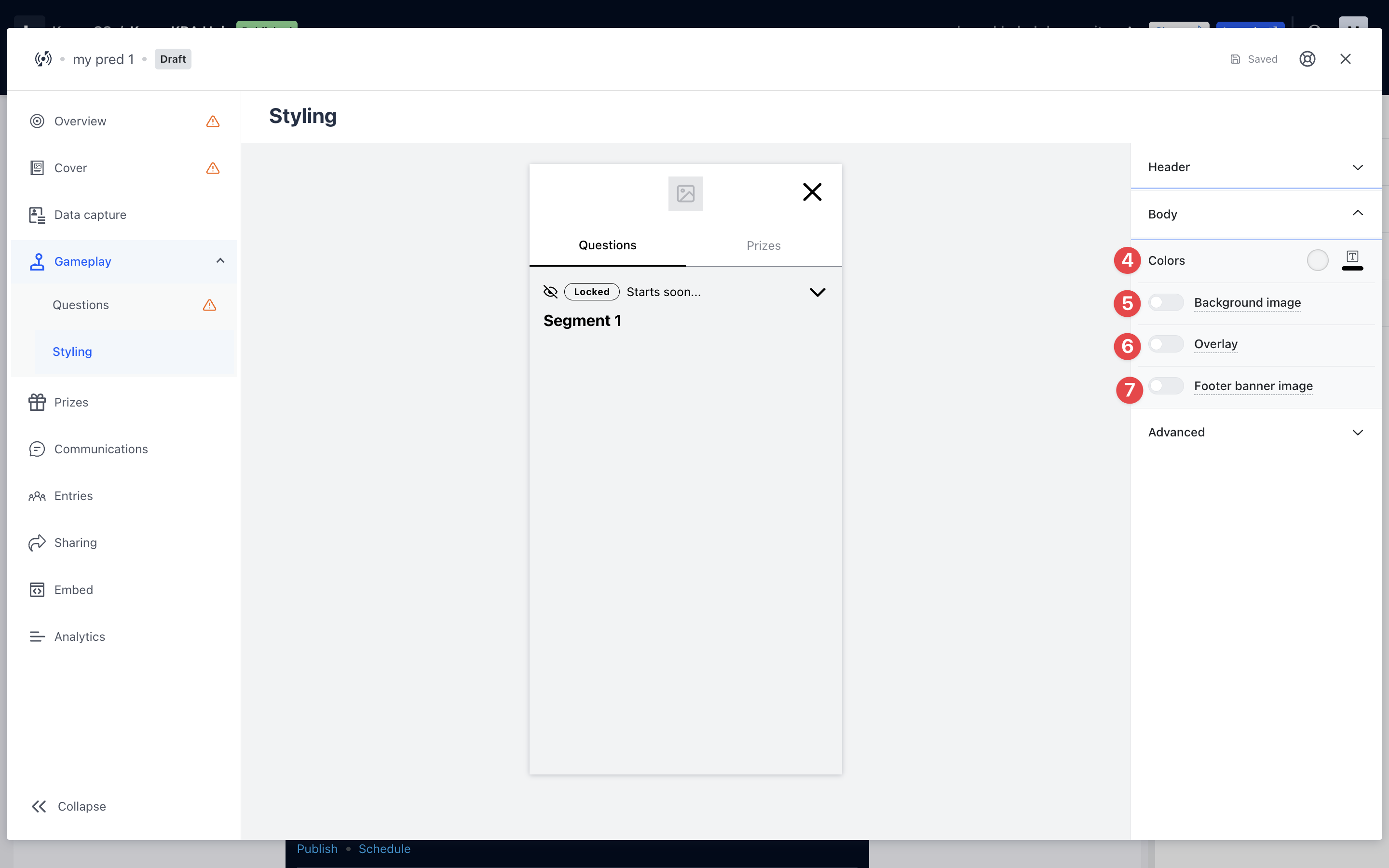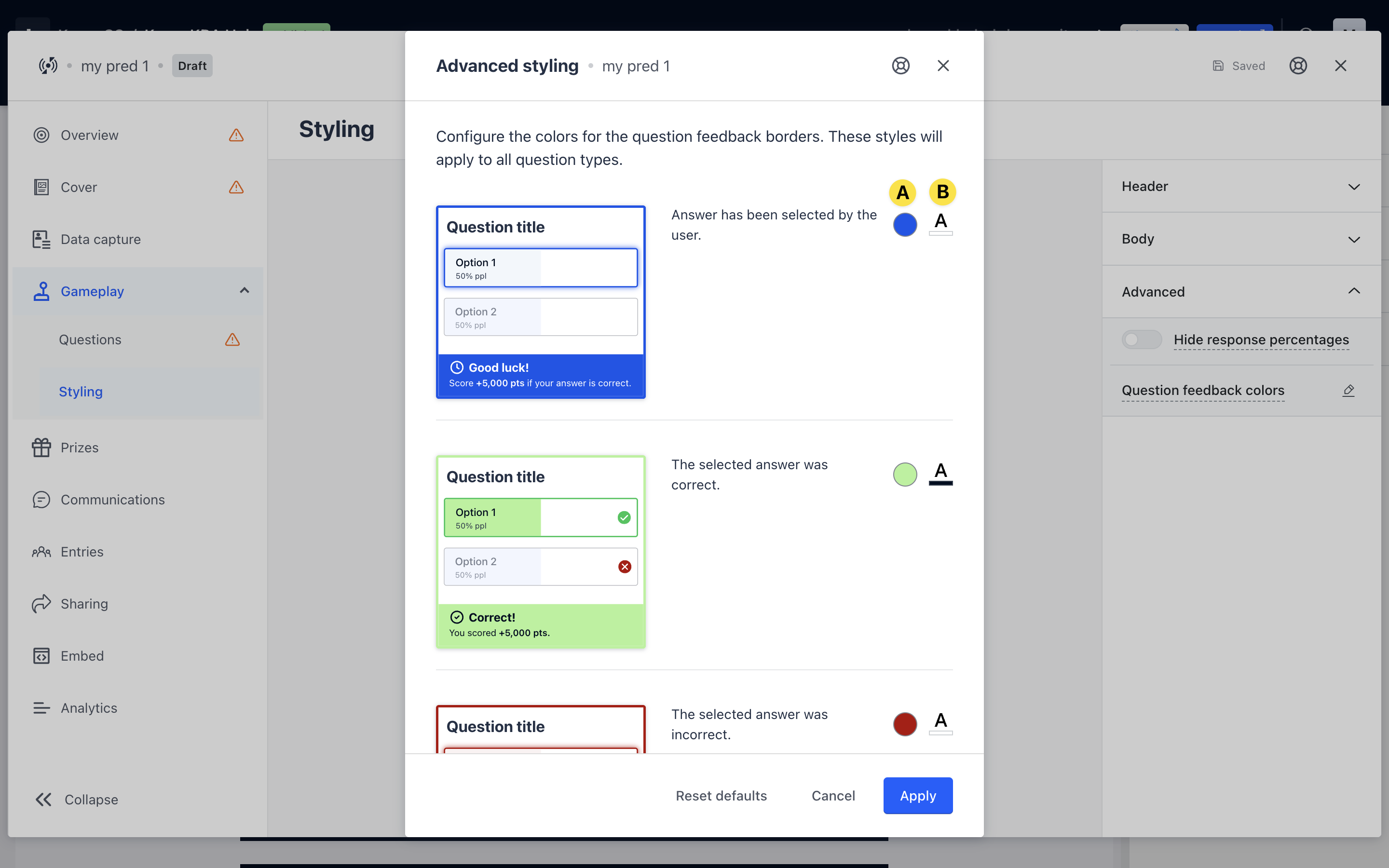 - Edit the gameplay styling to your brand colors. Make use of the Advanced styling tab to adjust the color of each border question feedback. Then you’re ready to go live!