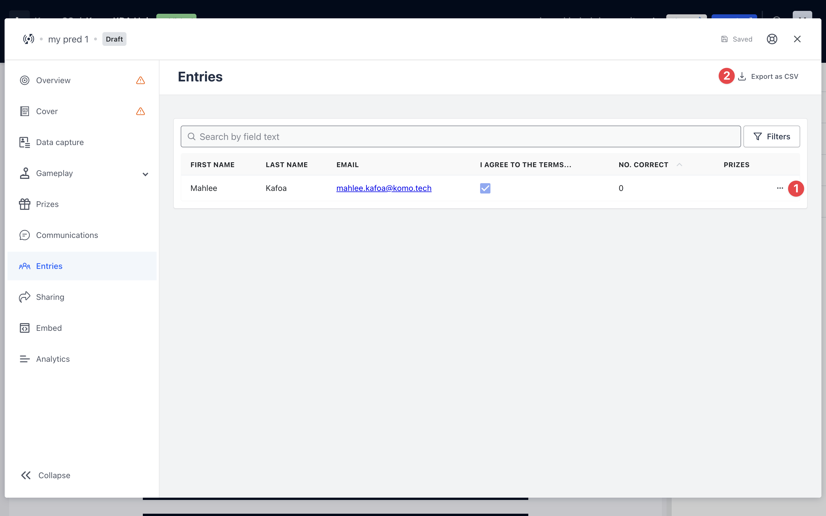 The information in this section will be everything you requested in the Data capture form, the number of predictions each entrant has made and the total number of questions each entrant has got correct.