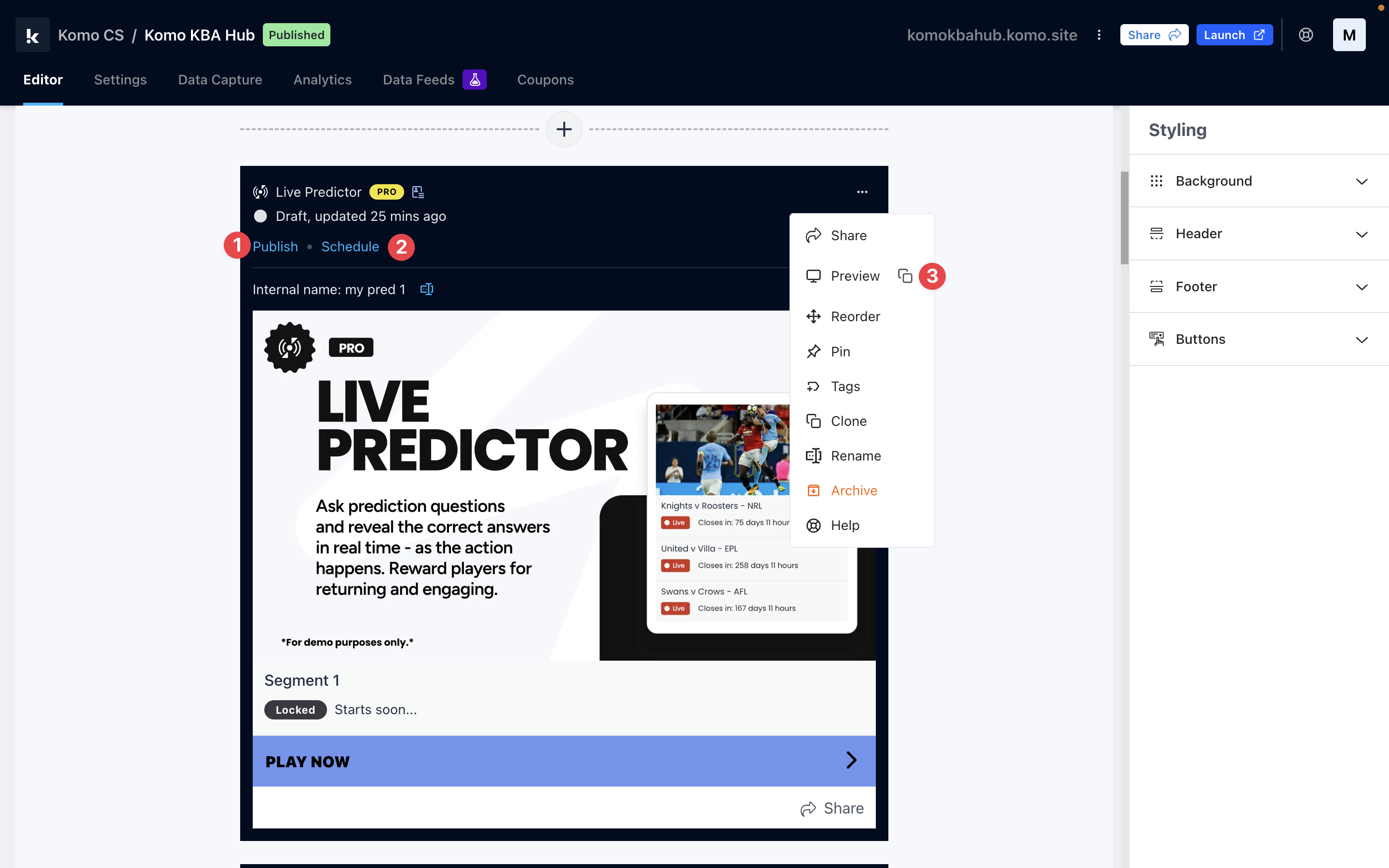 Unlike other cards the Live Predictor card comes with a data capture already added, you will just be required to finish setting it up. For a guide on how to do this check out our article below.Ready to set up your competition?