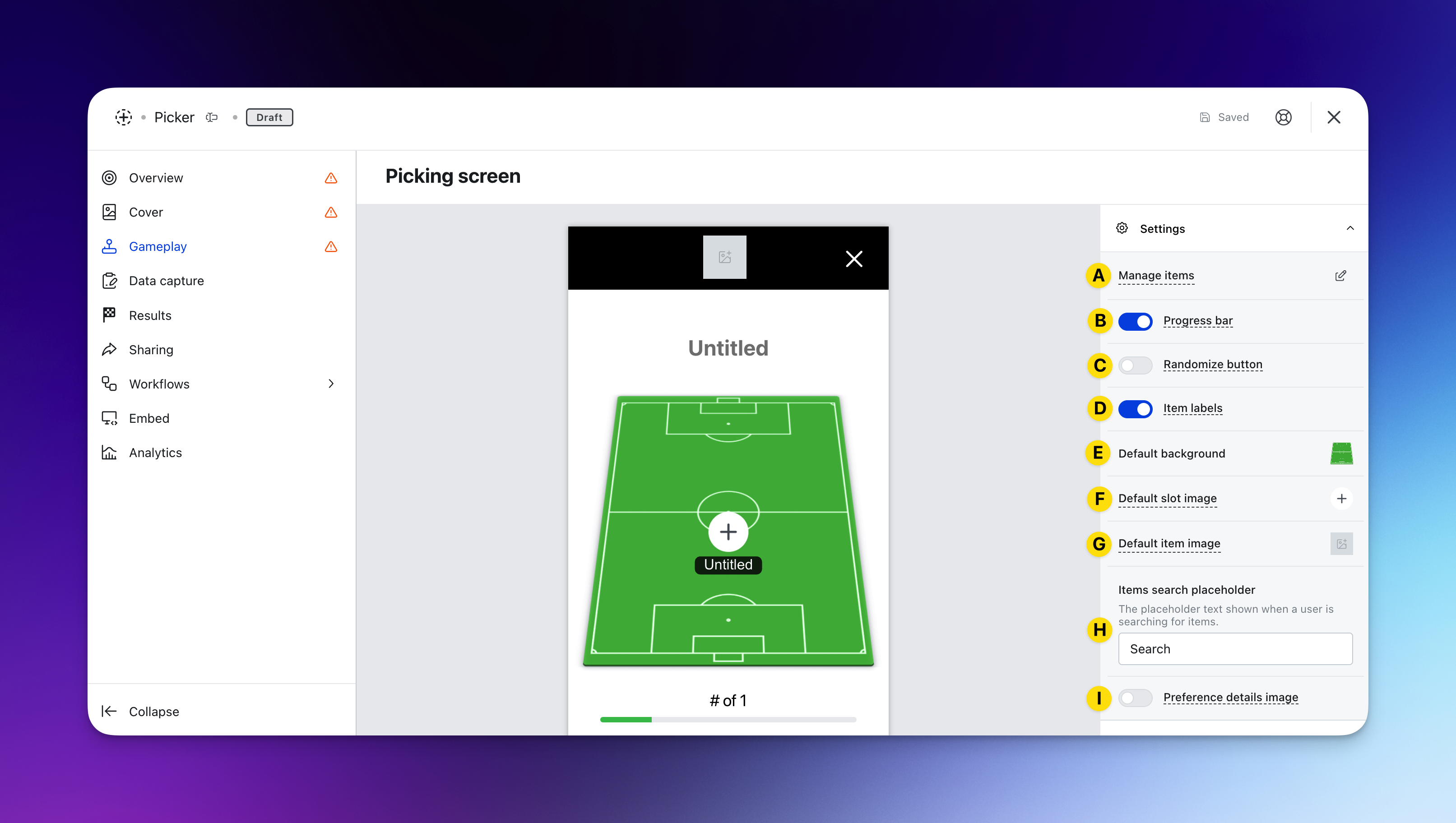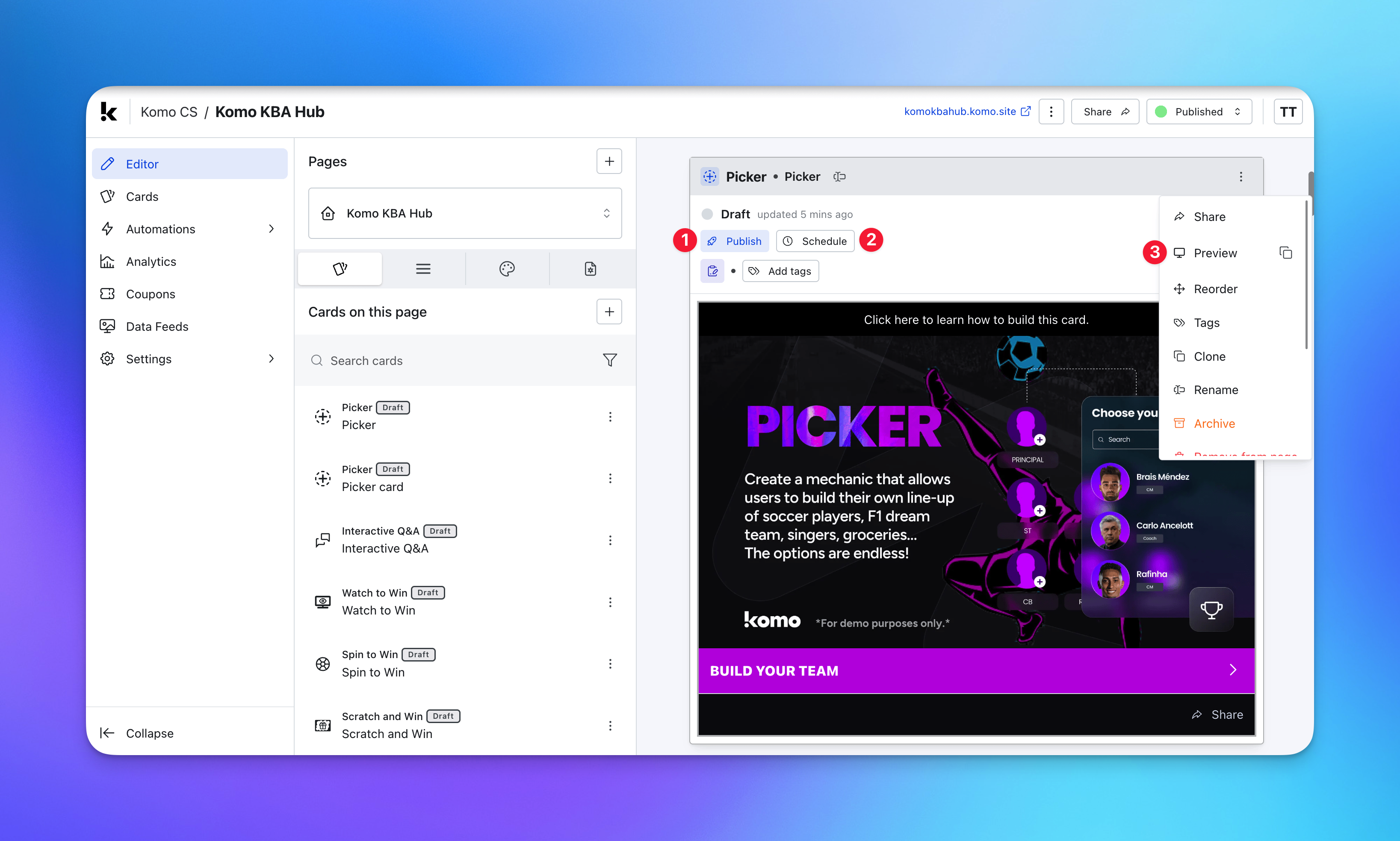 The Picker Card allows users to select and create their dream sports team, burger of the month, new cocktail and many more! This interactive experience lets users build their perfect combination by selecting items and placing them in designated positions on a visual formation.How do I build one?