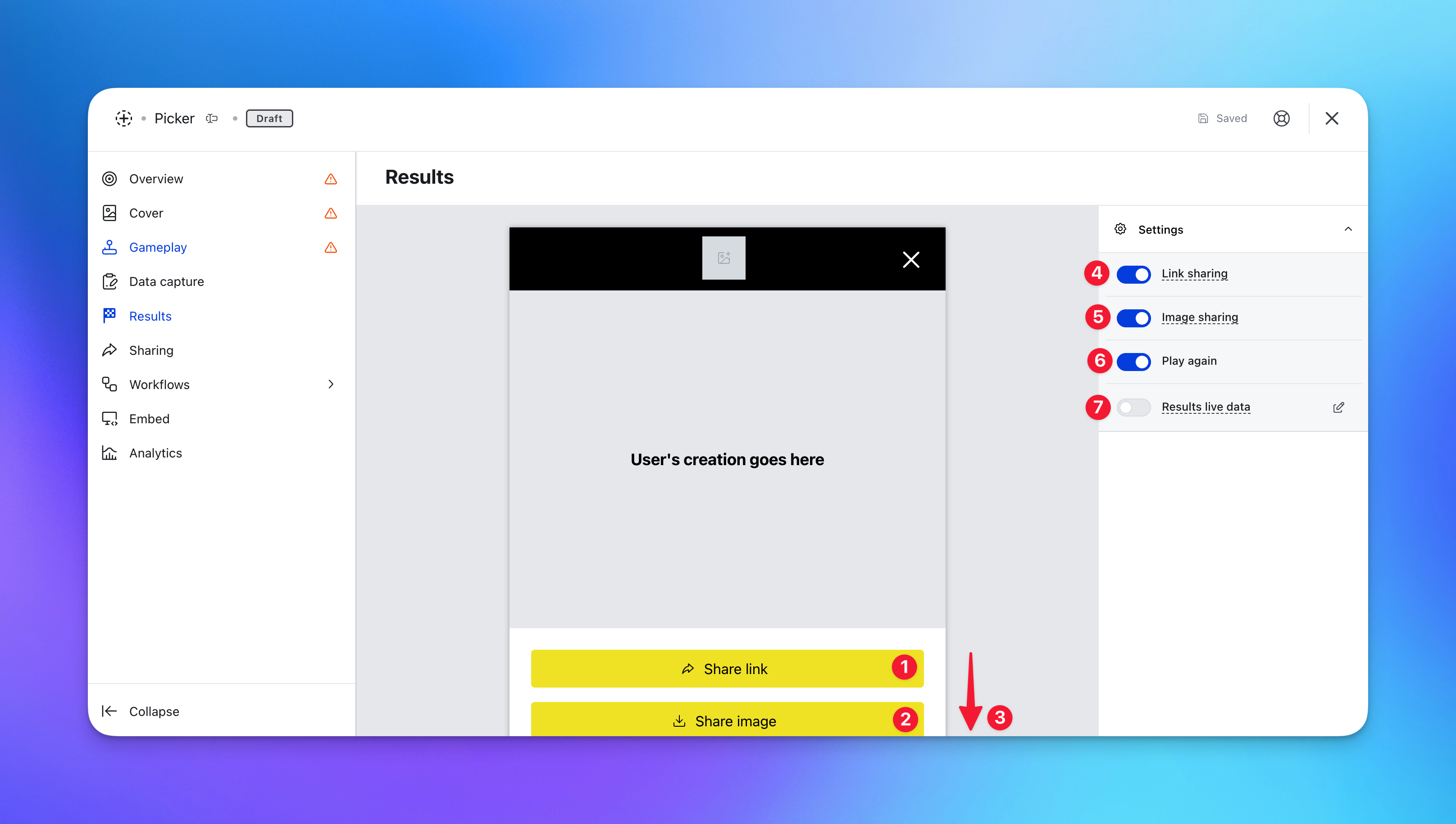 - (3) Here you can alter the color and copy of the Play again call-to-action or (6) toggle this off