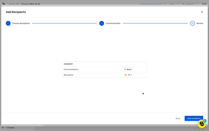 • Once you have set up your communications you can click Add recipients.