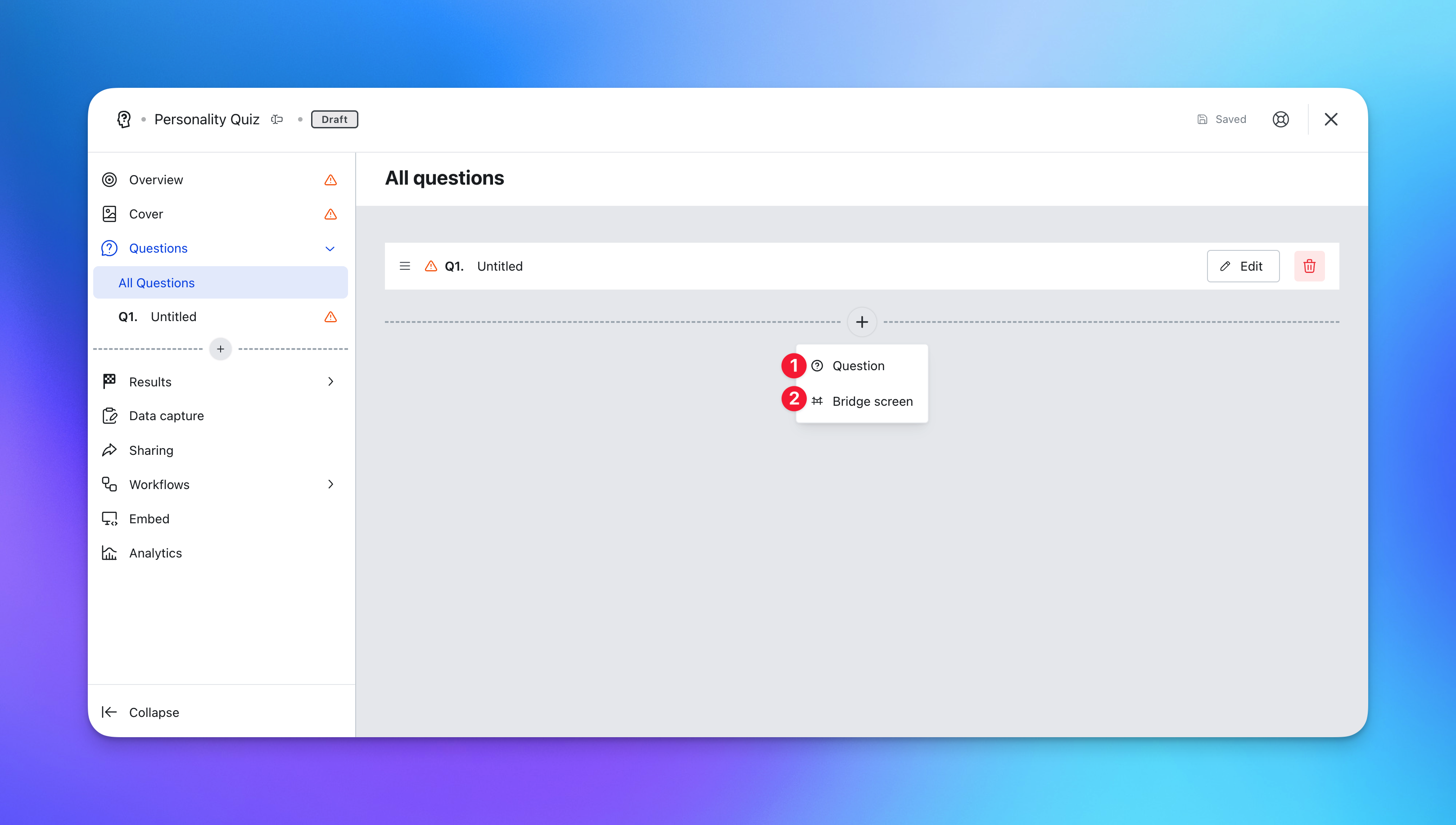 (1) Question - This allows you to add your questions to your Quiz.
