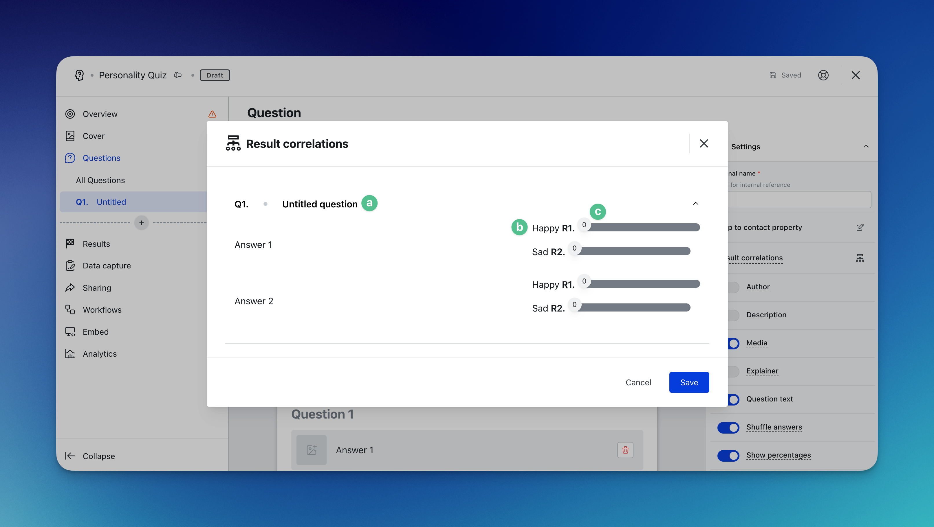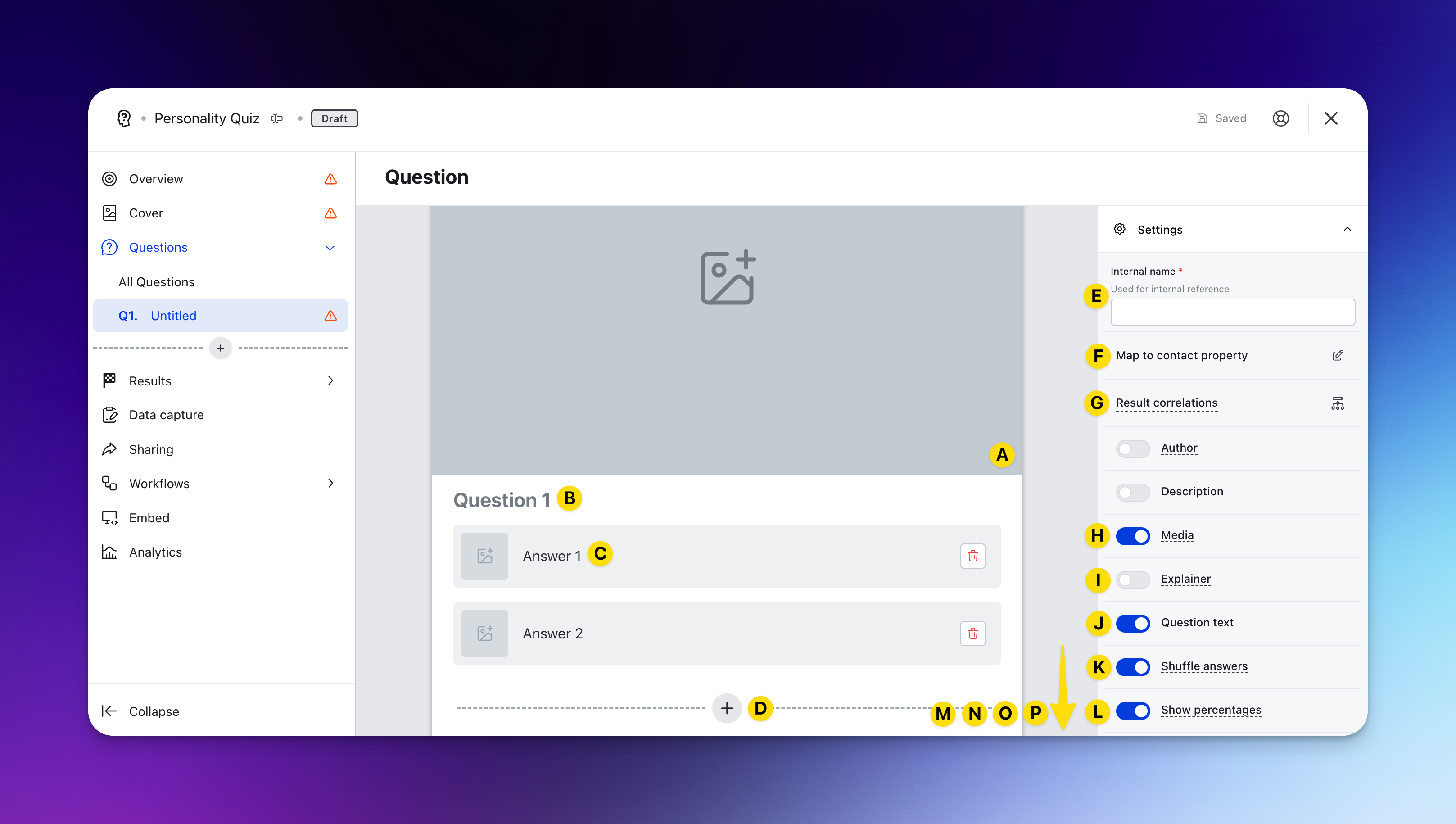 - (G) Here you will be able to see every question set up within your quiz and allocate the number of points each answer should give to each outcome.