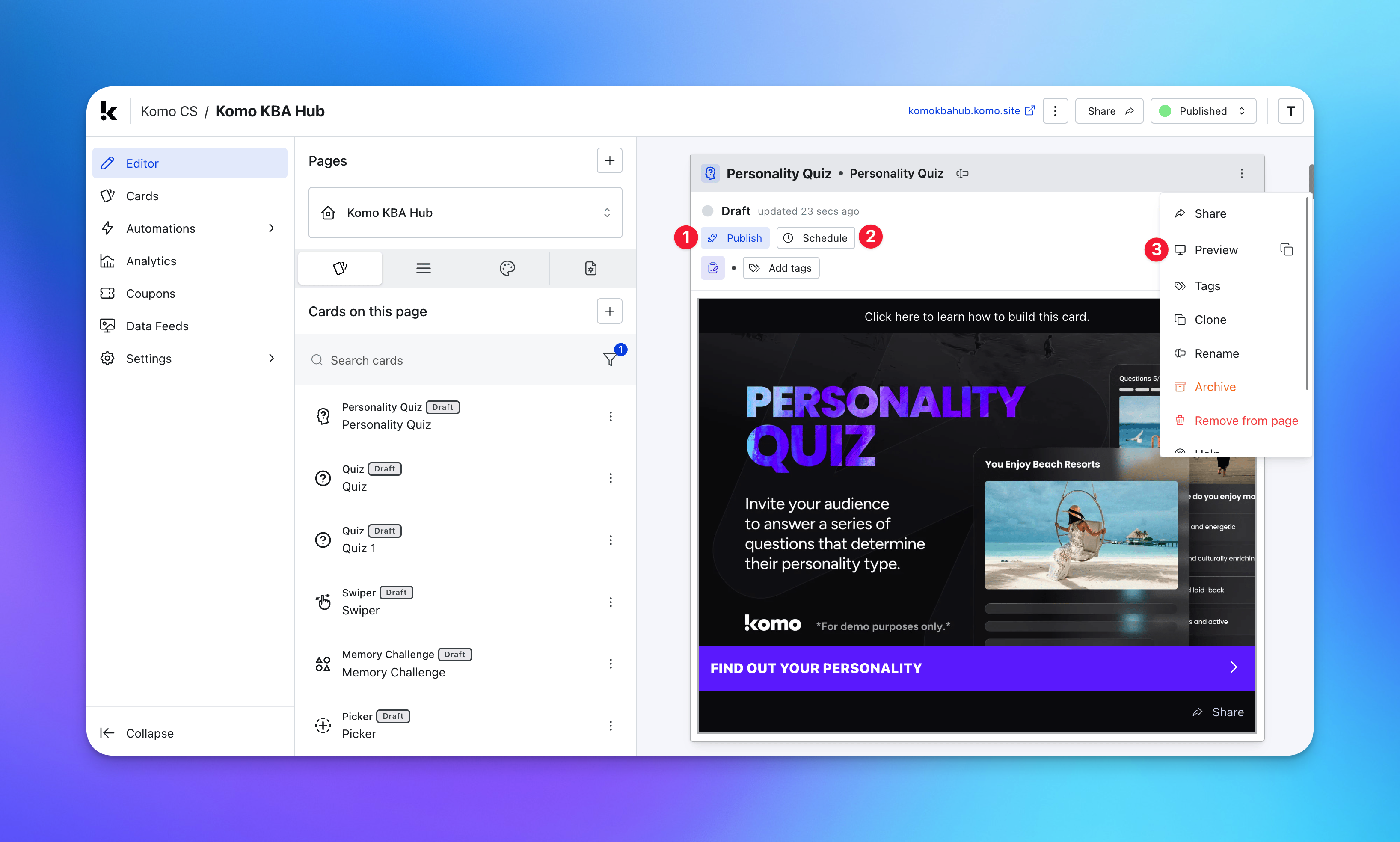 - (3) Click on the … to Preview and interact with the card on the front end from a user’s perspective before publishing it. See how to test your card here.